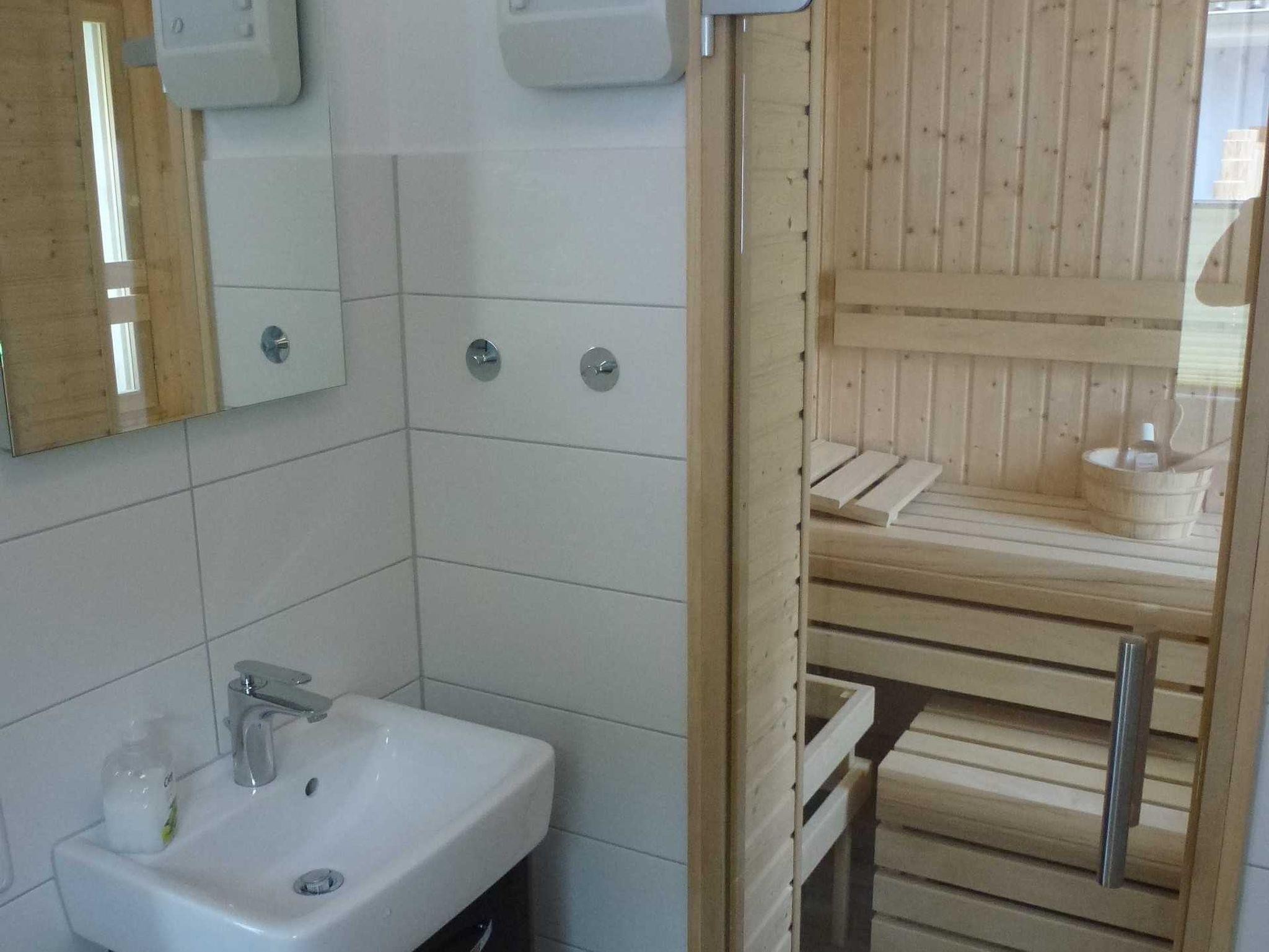 Sauna-Bad im Erdgeschoss mit bodengleicher Dusche, einen Hauswirtschaftsraum