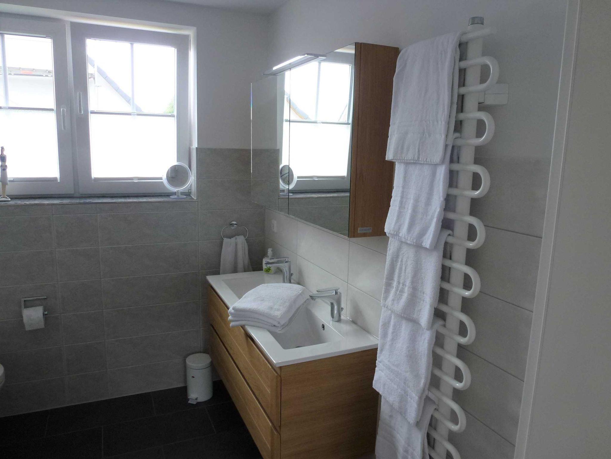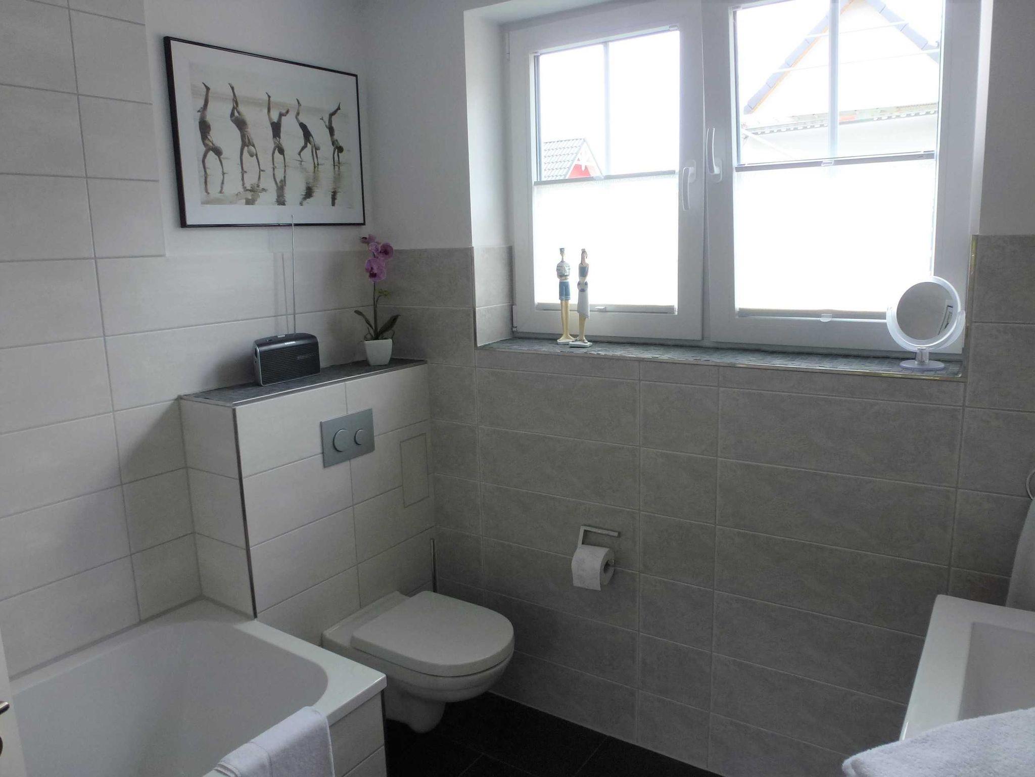 große Bad mit Badewanne, WC und Doppelwaschtisch.