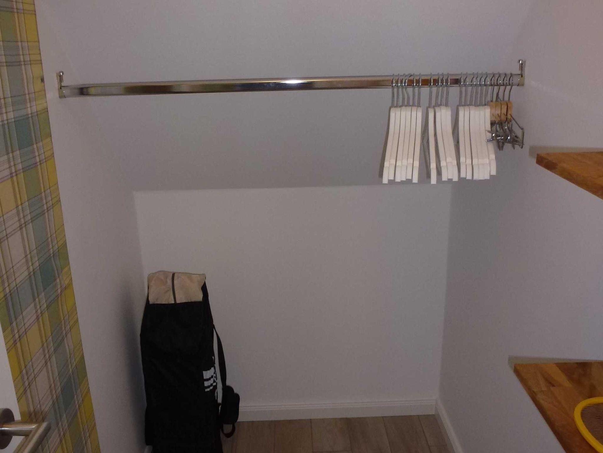 Wäscheständer und einen kleinen Arbeitsplatz unter der Treppe. Alles ist