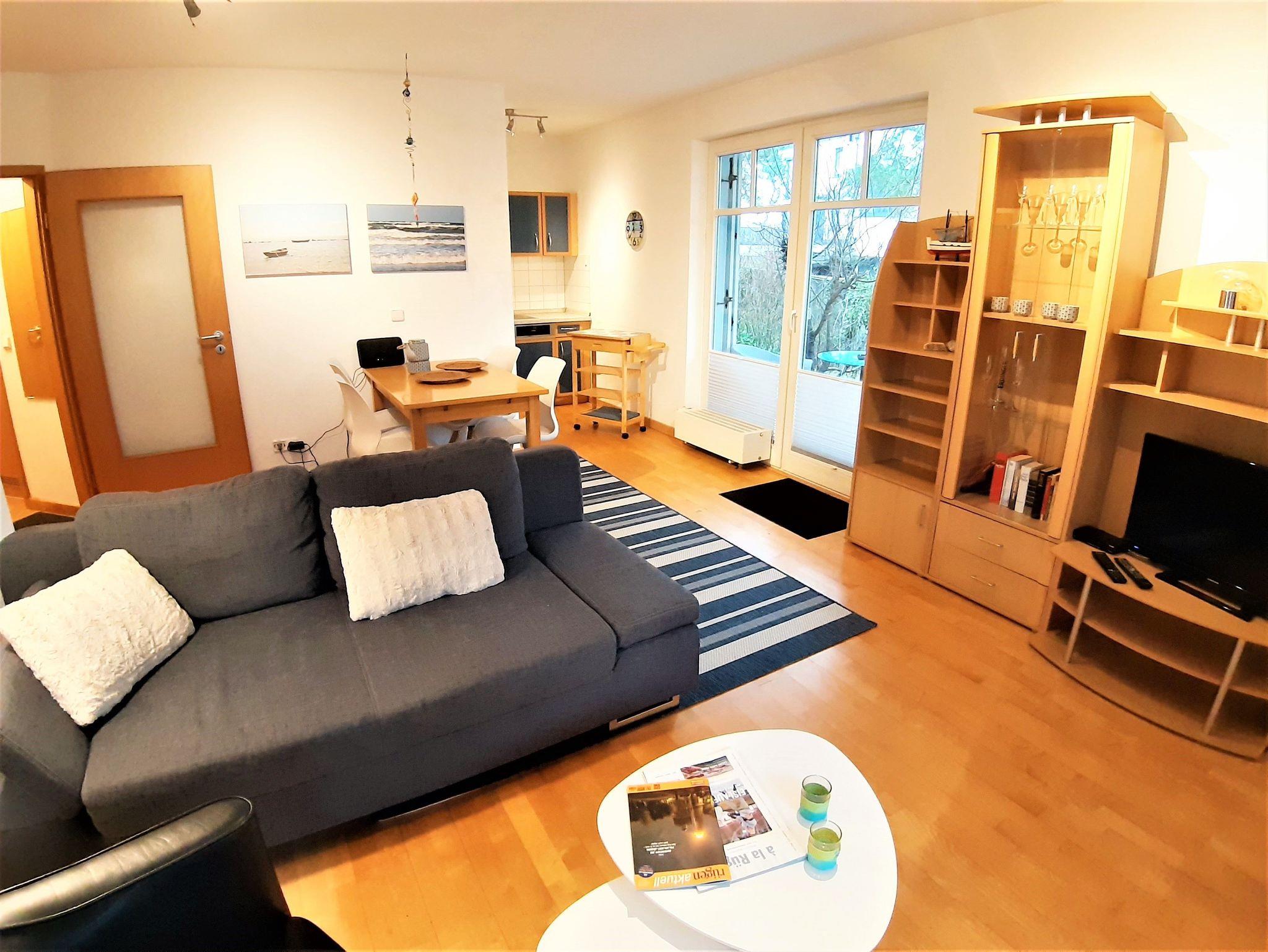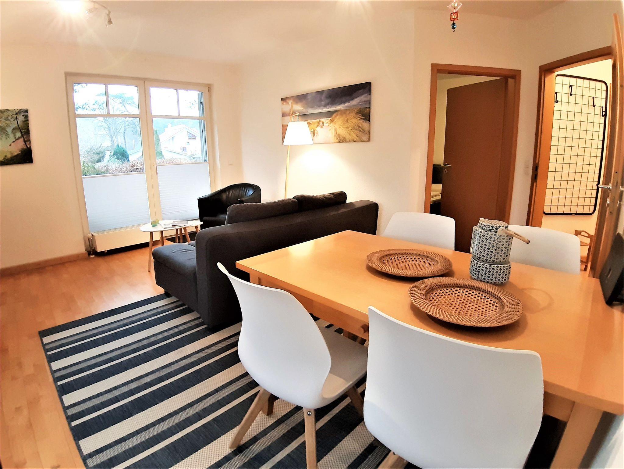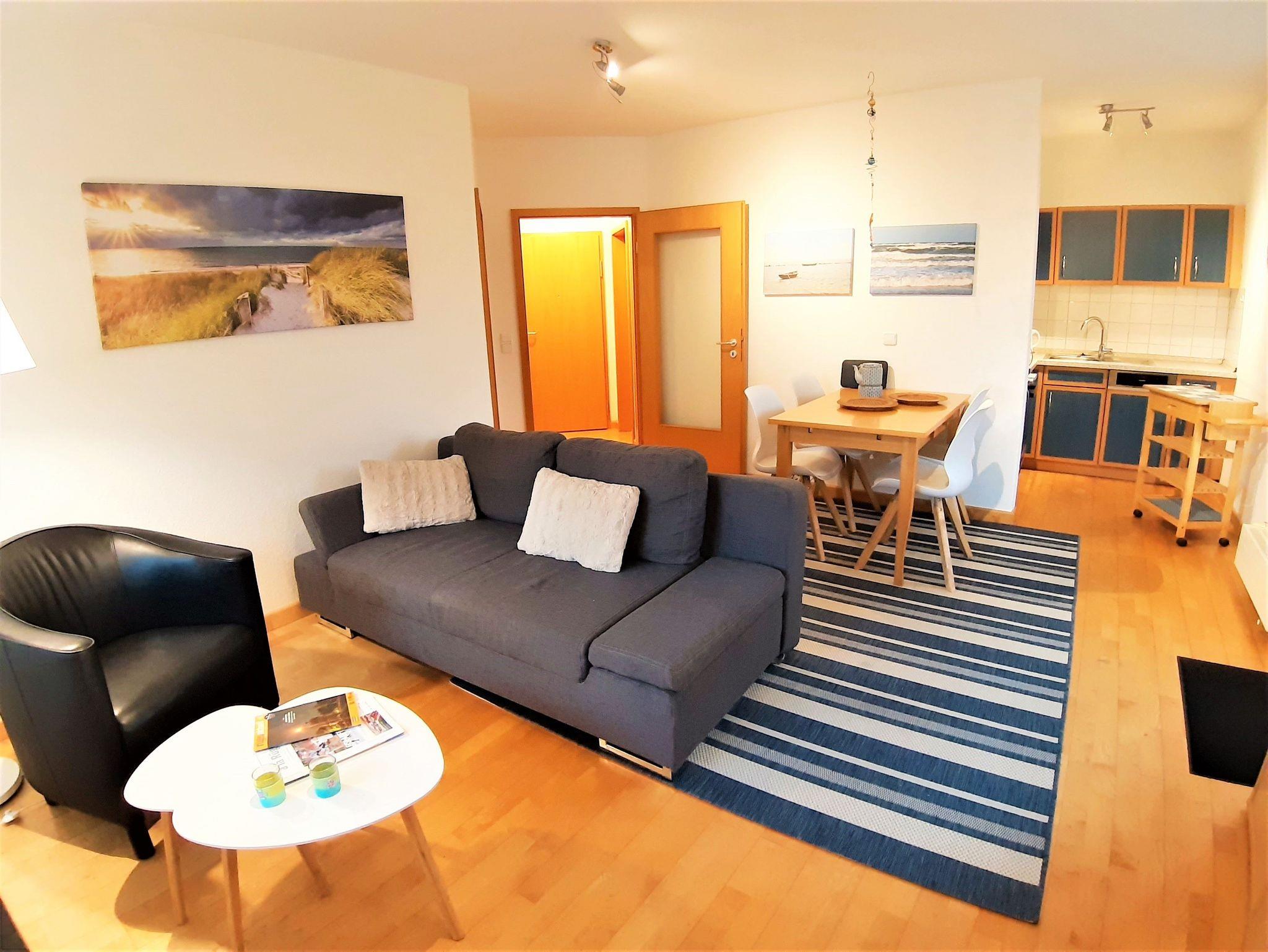 Die kleine Wohnung Abendrot liegt direkt hinter der Düne des Ostseestrandes in Juliusruh. Sie besitzt ein Schlafzimmer mit Doppelbett, einen Wohnbereich mit integrierter Küche und zwei Balkone zum Entspannen. Das Bad beherbergt eine Dusche.