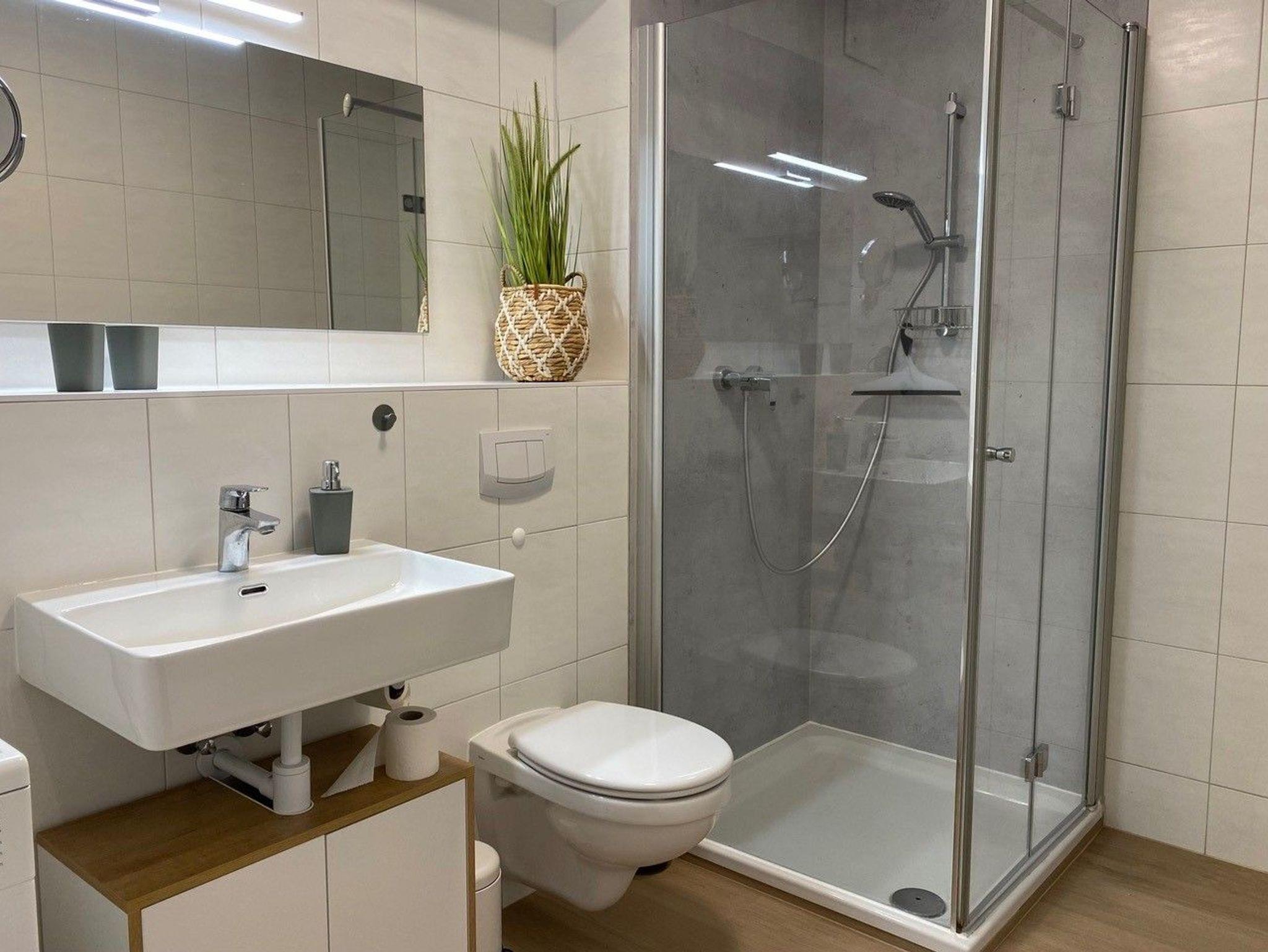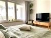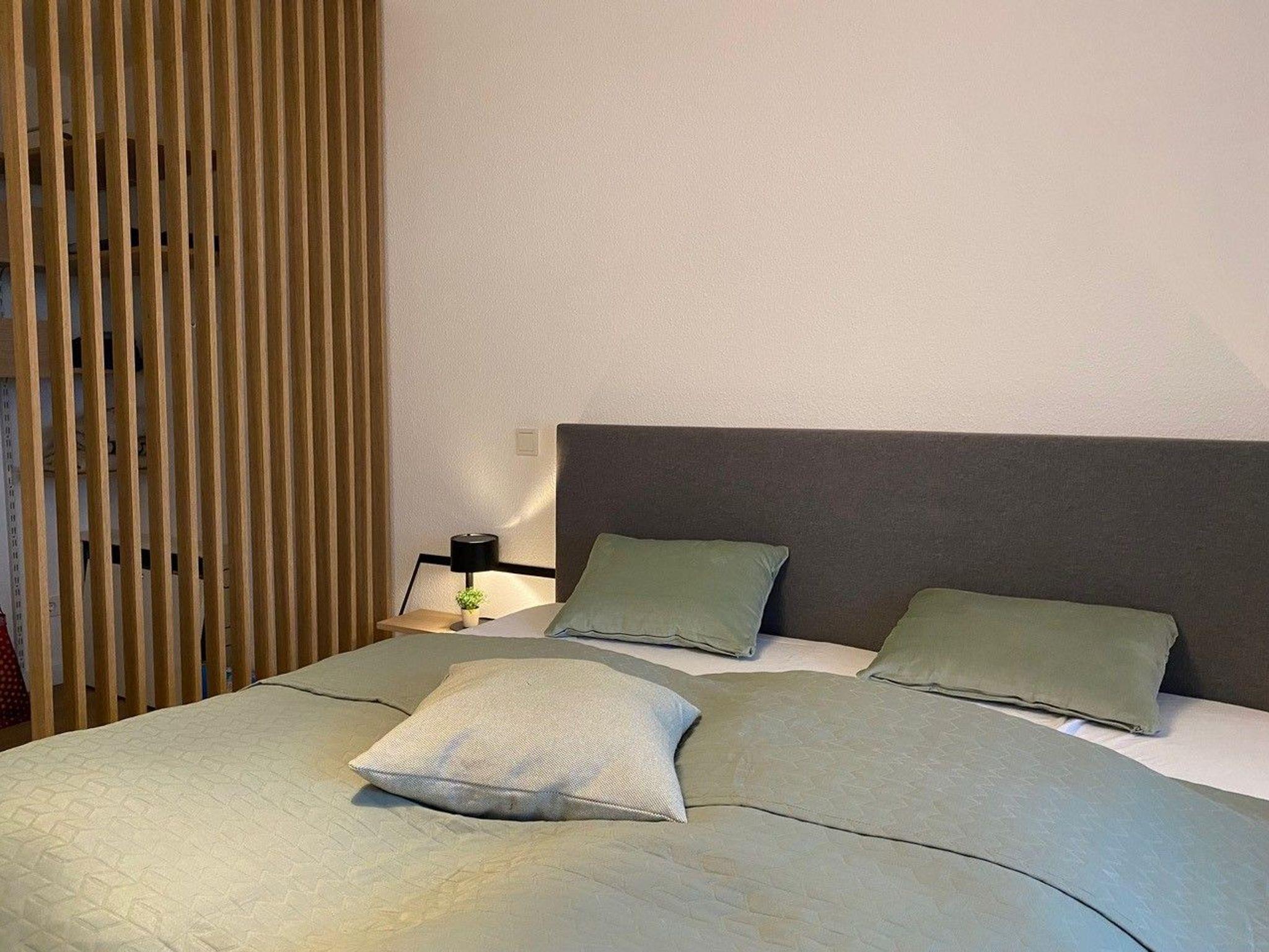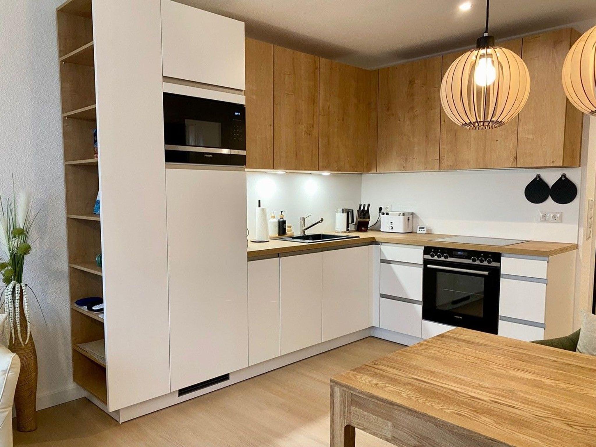 Die Wohnung ist hoch- und neuwertig eingerichtet und vorallem nachhaltig eingerichtet. Das Schlafzimmer mit Echtholzmöbeln beherbergt ein großes Doppelbett, einen begehbaren Kleiderschrank und eine Infrarotkabine. In den großzügigen Wohnbereich ist eine moderne, vollausgestattete Küche integriert, außerdem finden Sie einen Essbereich sowie eine behagliche Couchecke mit großem TV-Gerät.