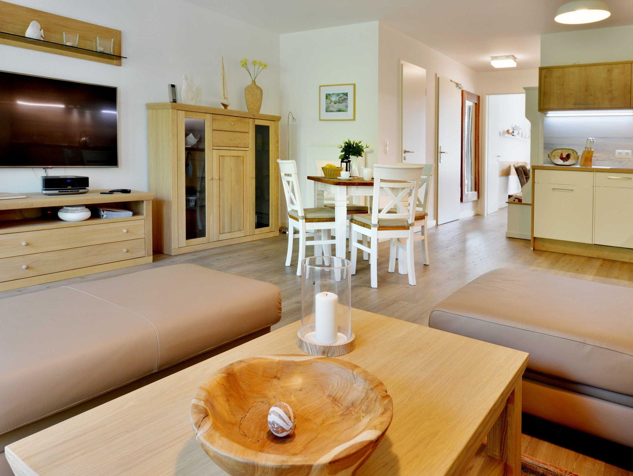 Das Domizil verfügt über einen großzügigen Wohn- und Essbereich mit vollausgestatteter Küche, ein Schlafzimmer mit Doppelbett und ein Bad mit Dusche. Die Einrichtung ist brandneu und hochwertig. Auf zwei Balkonen relaxen Sie nach Wunsch über Sonne und Schatten mit Blick auf´s Meer.