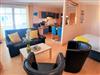 Der Wohnbereich verfügt über eine Küchenzeile, eine Sitzecke mit Couch und TV sowie etwas abgetrennt, ein Doppelbett. Der Balkon ist aus dem Wohnbereich begehbar.