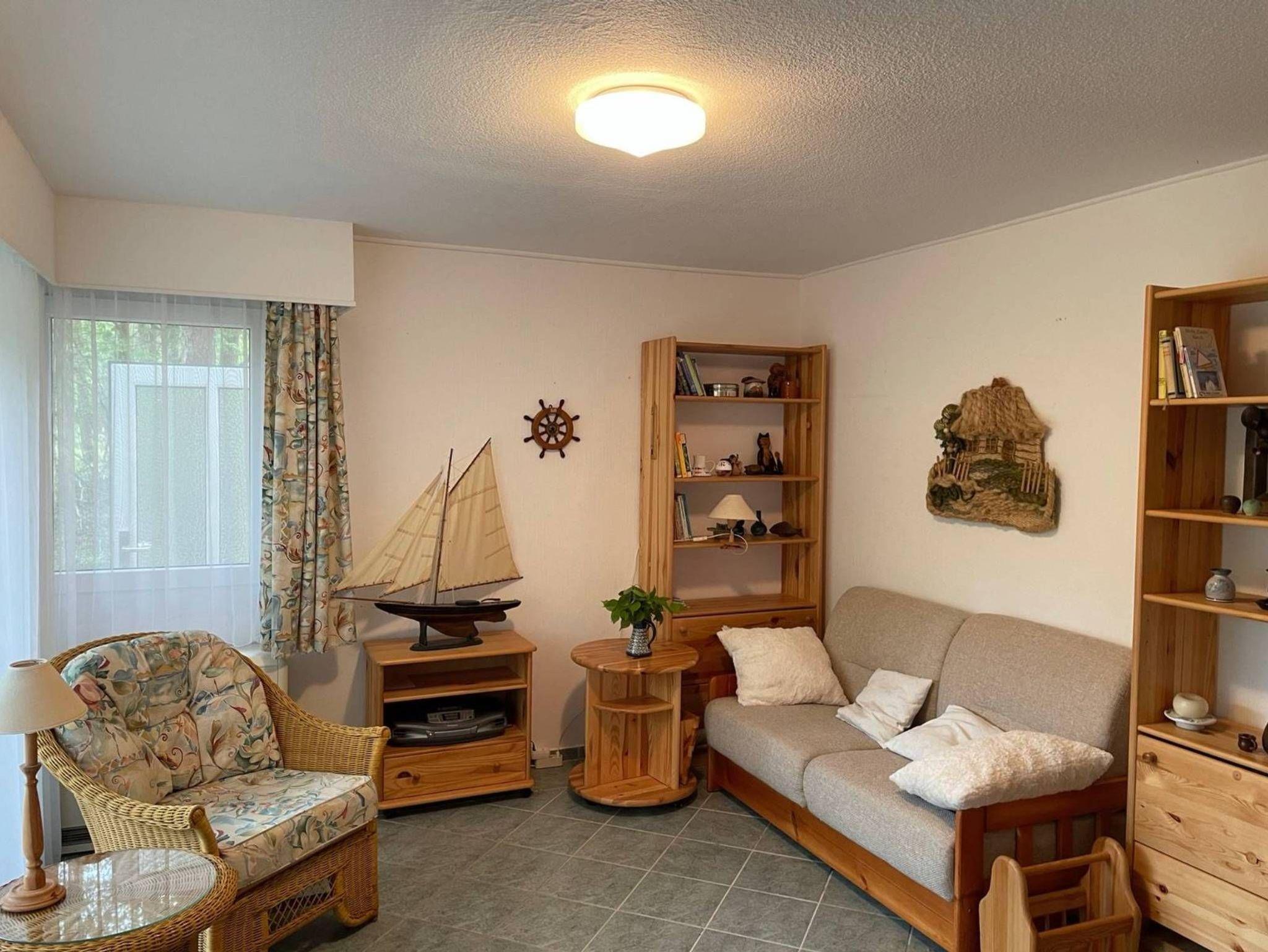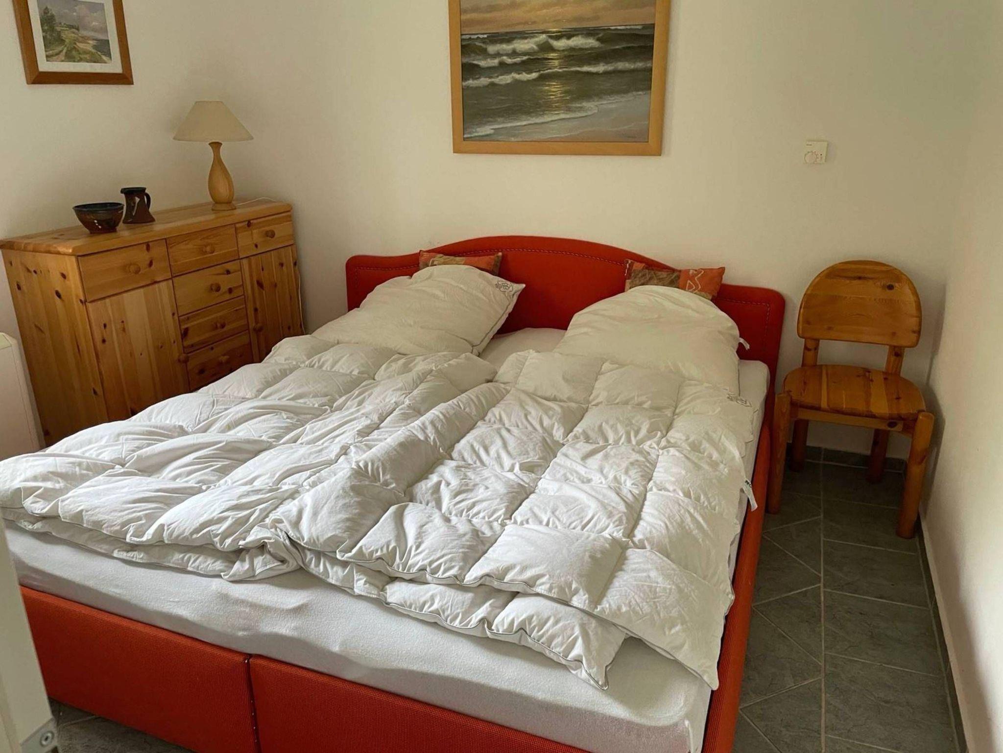 Im Schlafzimmer befindet sich ein Doppelbett, während im Wohnzimmer eine Schlafcouch als zusätzliche Aufbettungsmöglichkeit zur Verfügung steht. Ein geräumiger Kleiderschrank bietet ausreichend Platz für Ihr Gepäck.