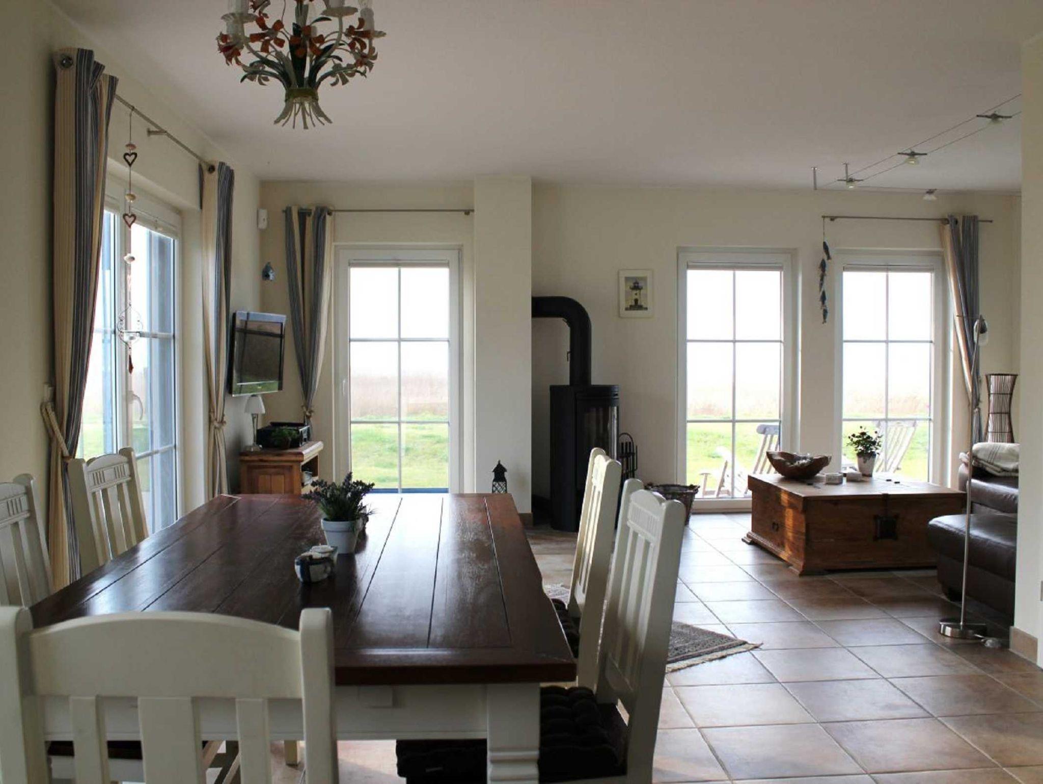 Die Verbindung zwischen beiden Wohnbereichen wird durch einen großzügigen Essbereich hergestellt. Auch von hier aus haben Sie den herrlichen Wasserblick auf den Bodden.