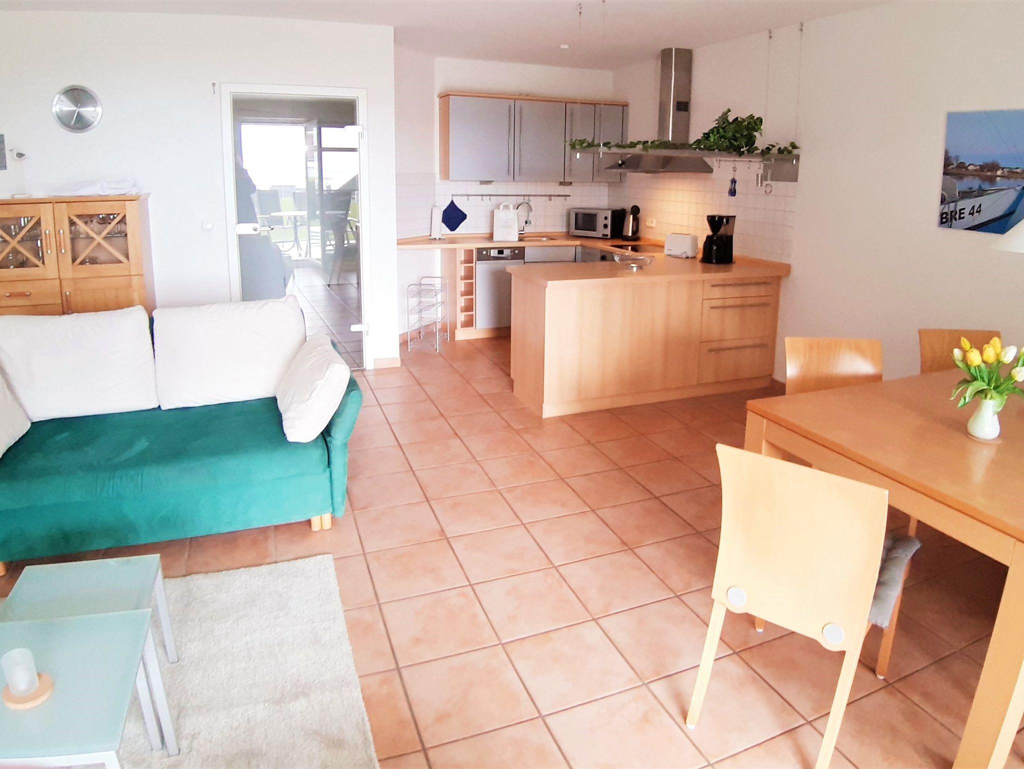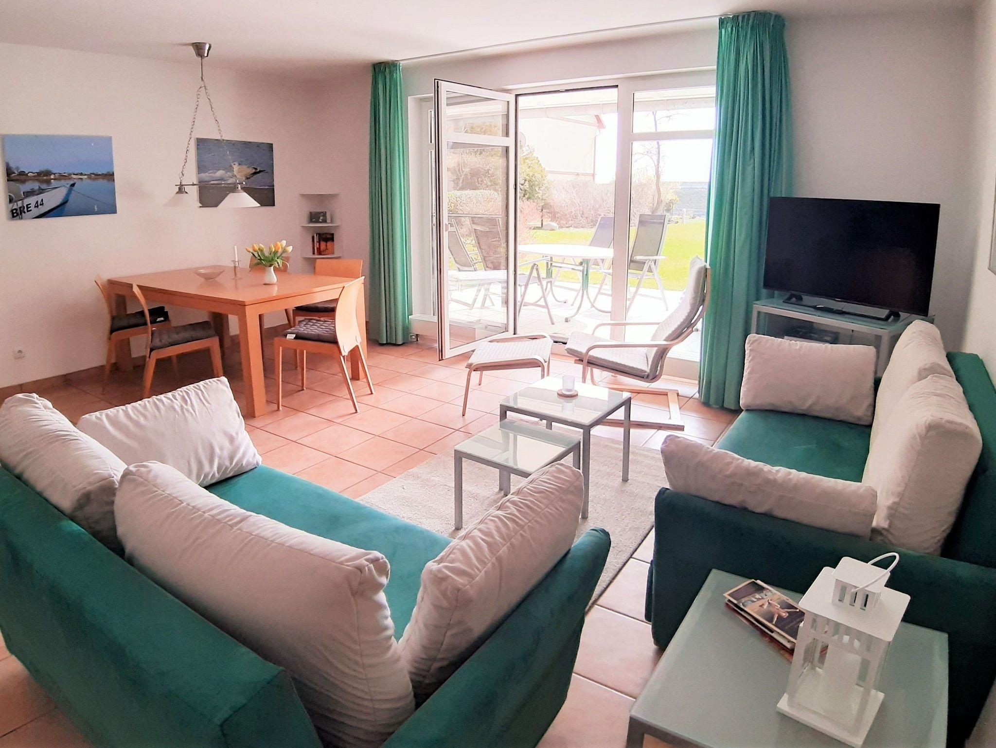 Unsere Ferienwohnung Hafenglück in Breege mit Blick auf den idyllischen Breeger Hafen bietet ein Schlafzimmer mit Doppelbett und zwei weitere Schlafgelegenheiten im Wohnzimmer (Schlafcouch). In den Wohnbereich ist eine komplett ausgestattete Küche mit Essbereich integriert. Von der anschließenden, geschützt liegenden Terrasse wird der Blick auf den Breeger Bodden und den kleinen Hafen frei. Im Bad befindet sich eine Dusche. Die Wohnung verfügt über einen Stellplatz und Fahrradparkplätze.