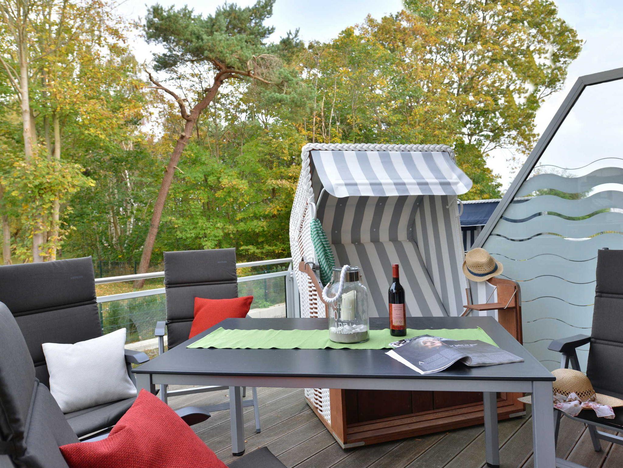 Terrasse mit Gartenmöbeln und Strandkorb