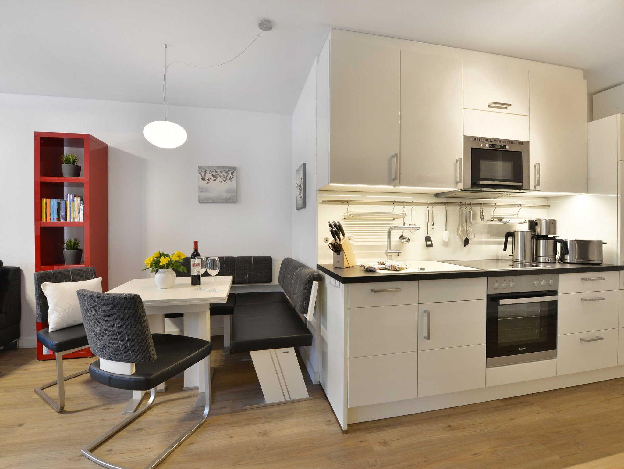 Küche mit Spülmaschine, Backofen, Kaffeemaschine, Mikrowelle, Kühlschrank mit Gefrierfach