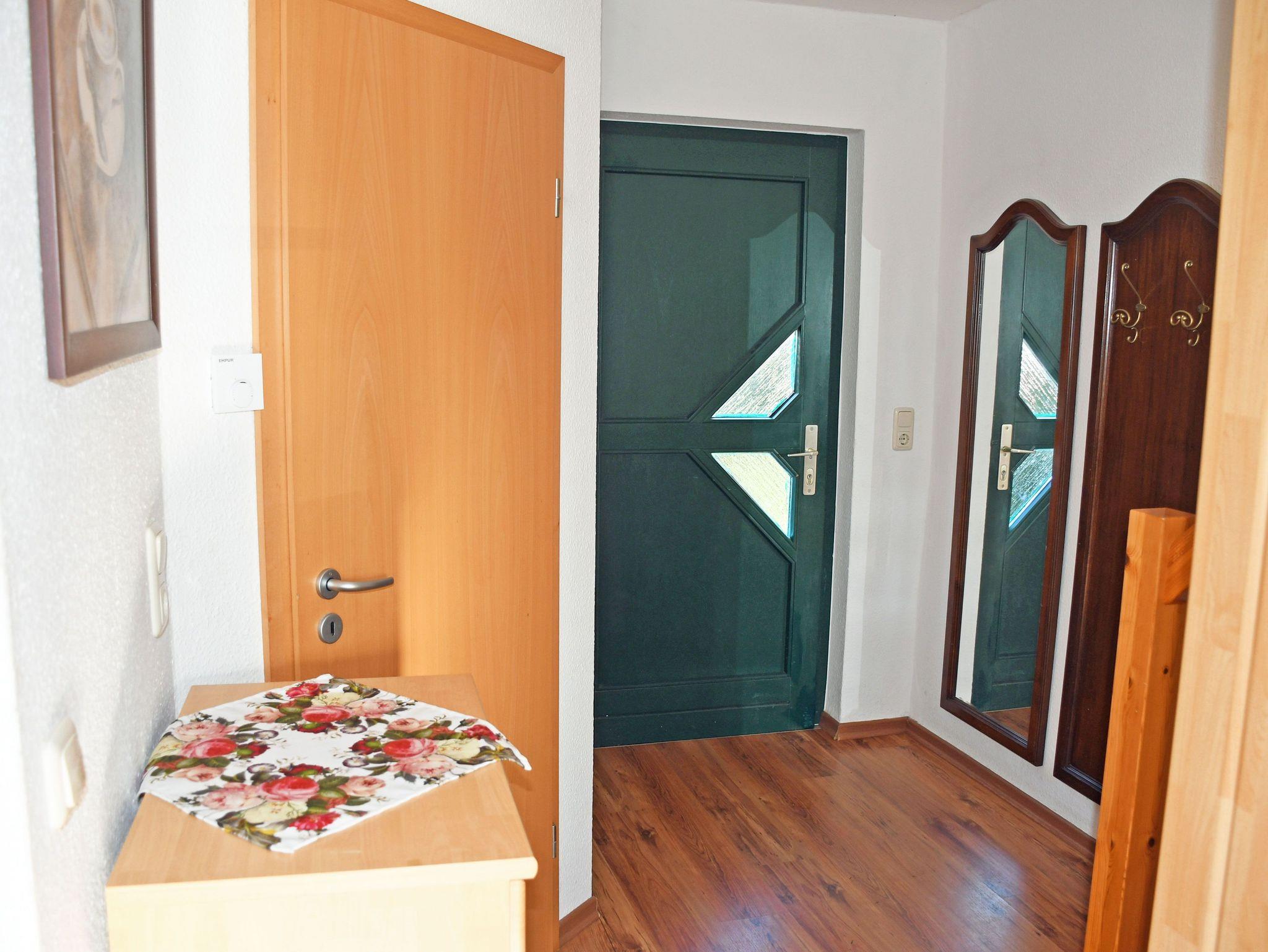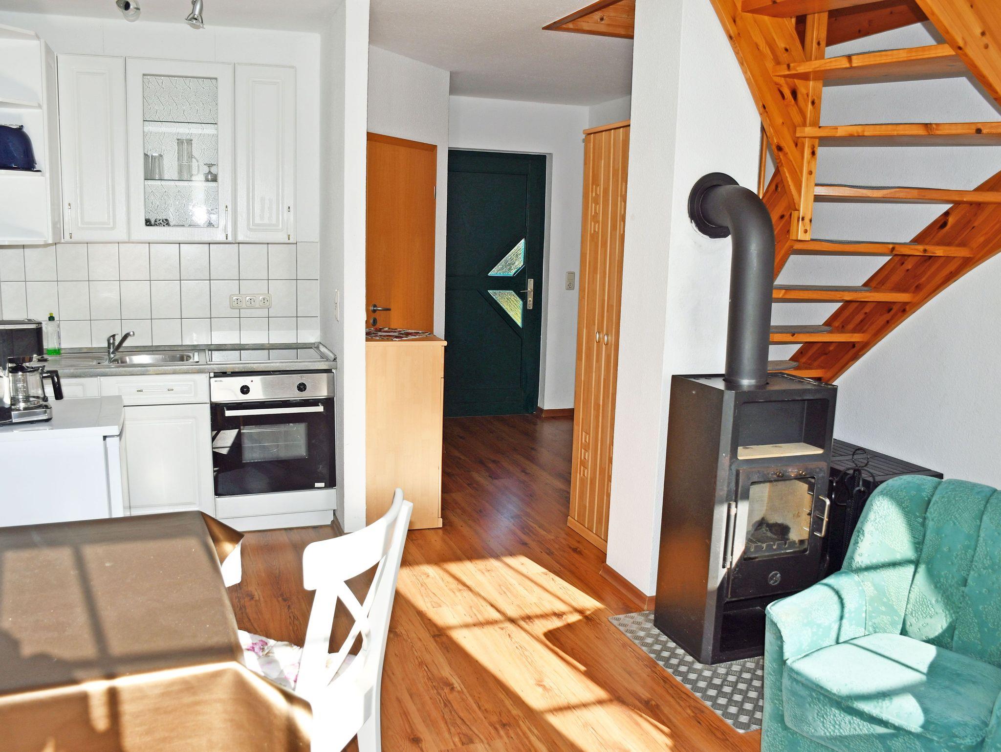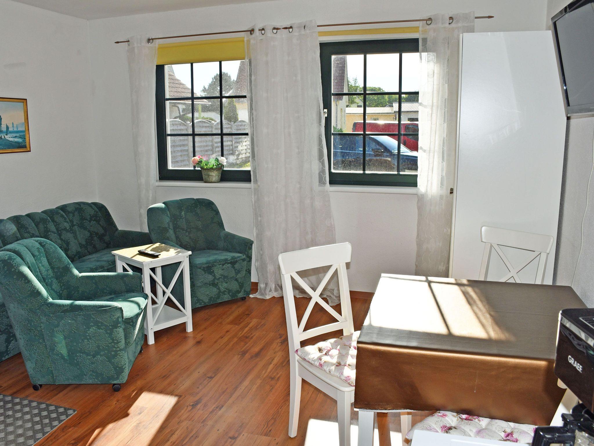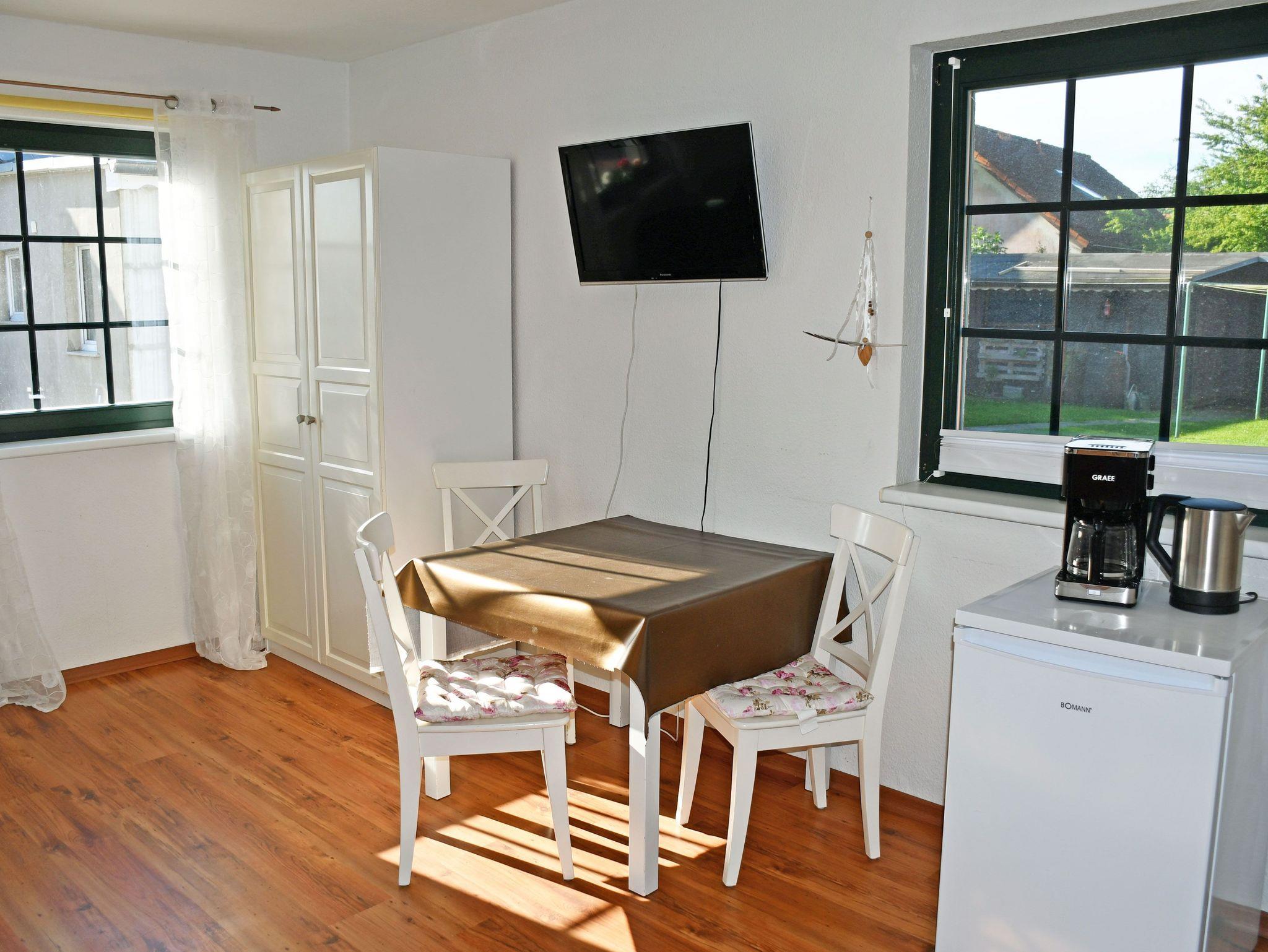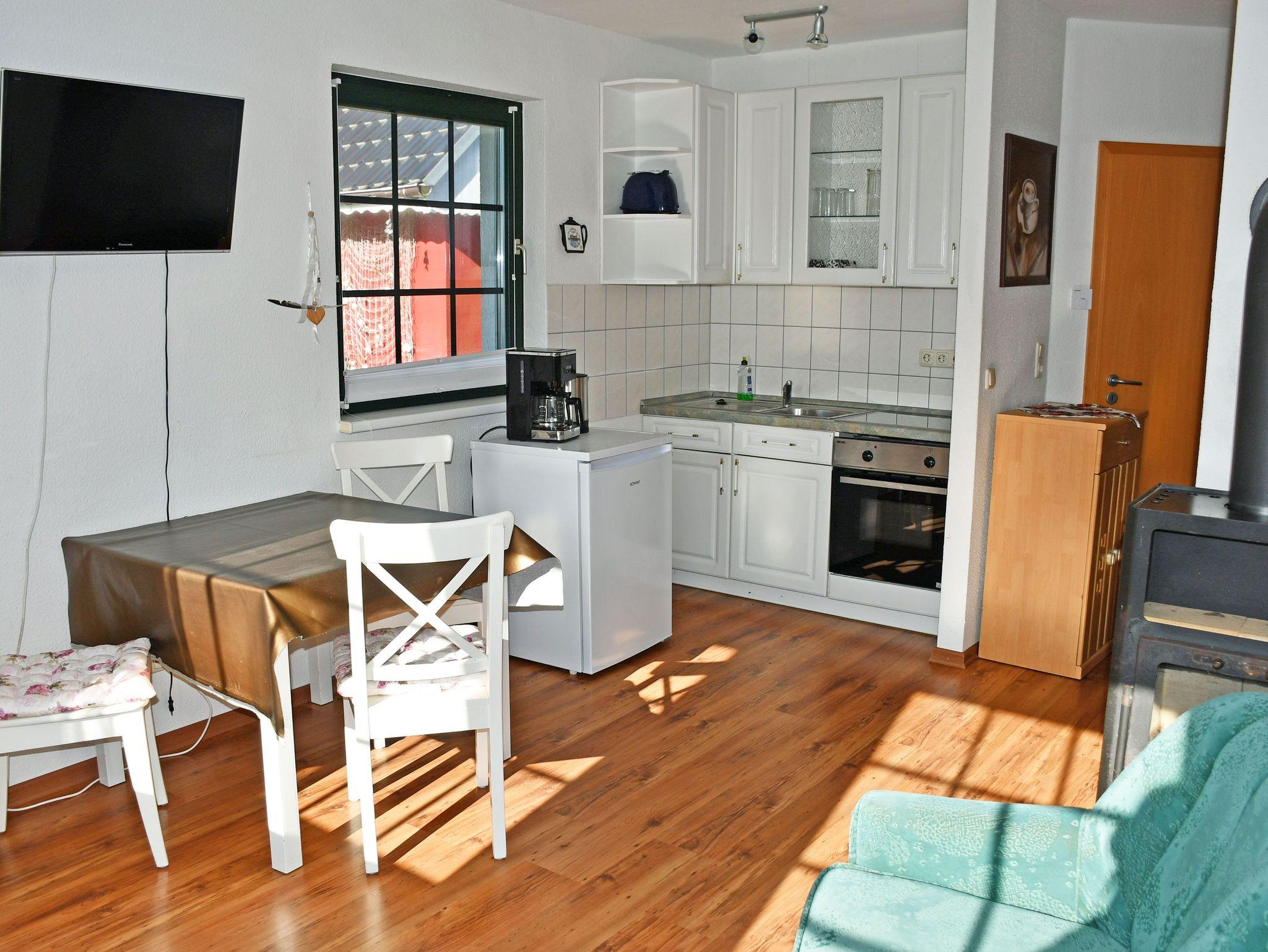 Unser ruhig gelegenes Ferienhaus ist ca. 55 qm groß und bietet Platz für maximal 4 Gäste. Es verfügt über einen separaten Eingang. In dem Wohnraum befinden sich eine Sitzcouch mit Tisch und Sessel sowie ein Sat TV-Gerät. Hier steht auch ein Esstisch mit ausreichend Sitzgelegenheiten. Die Küchenzeile ist mit einem Herd, Bachofen, Wasserkocher, Kaffeemaschine, Toaster und Kühlschrank komplett ausgestattet.