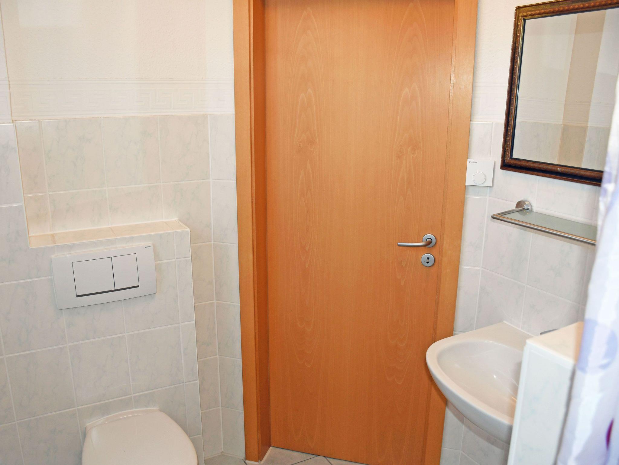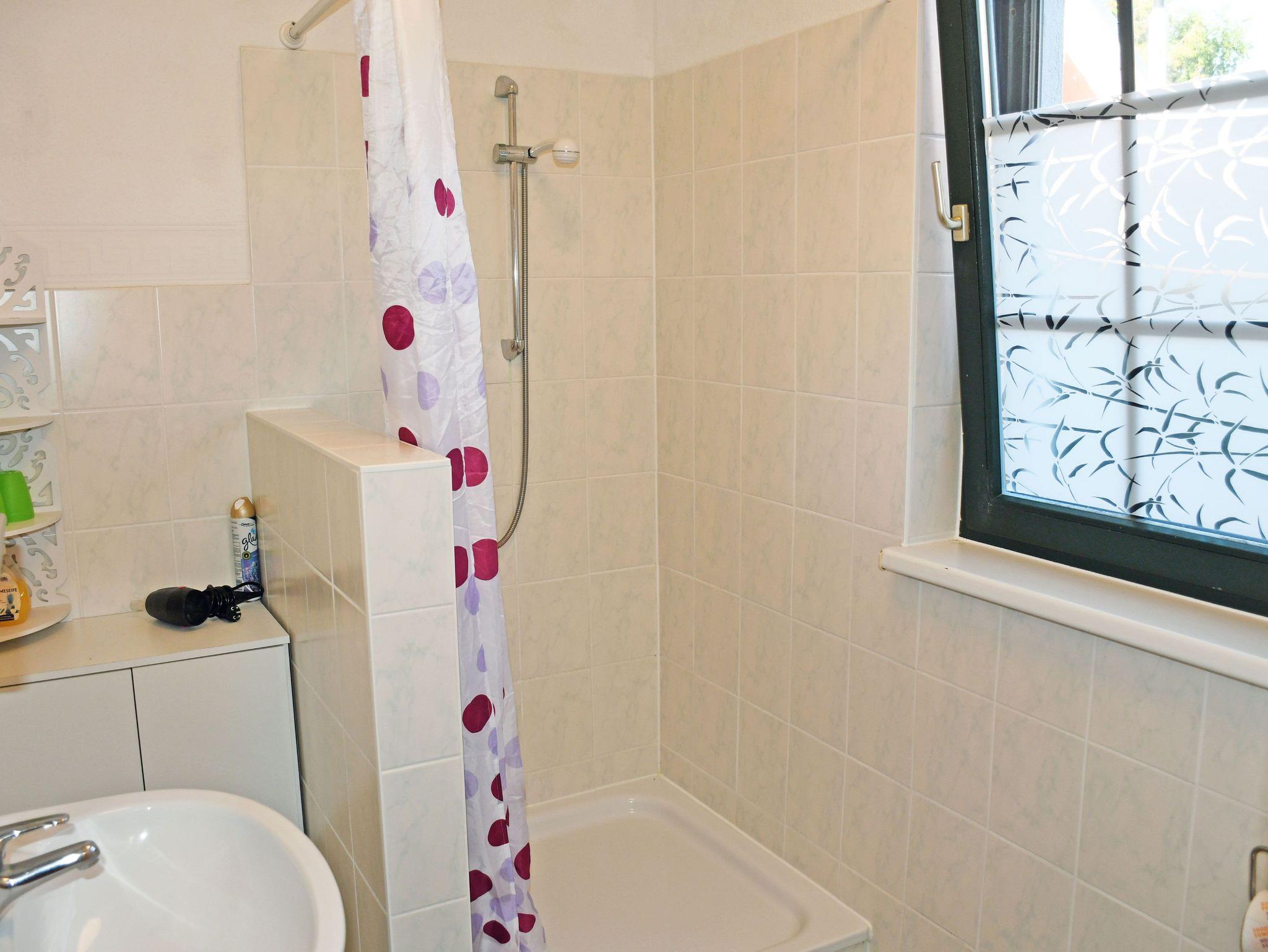 Das Bad ist mit Dusche, WC und Waschbecken ausgestattet und verfügt über Tagelicht.