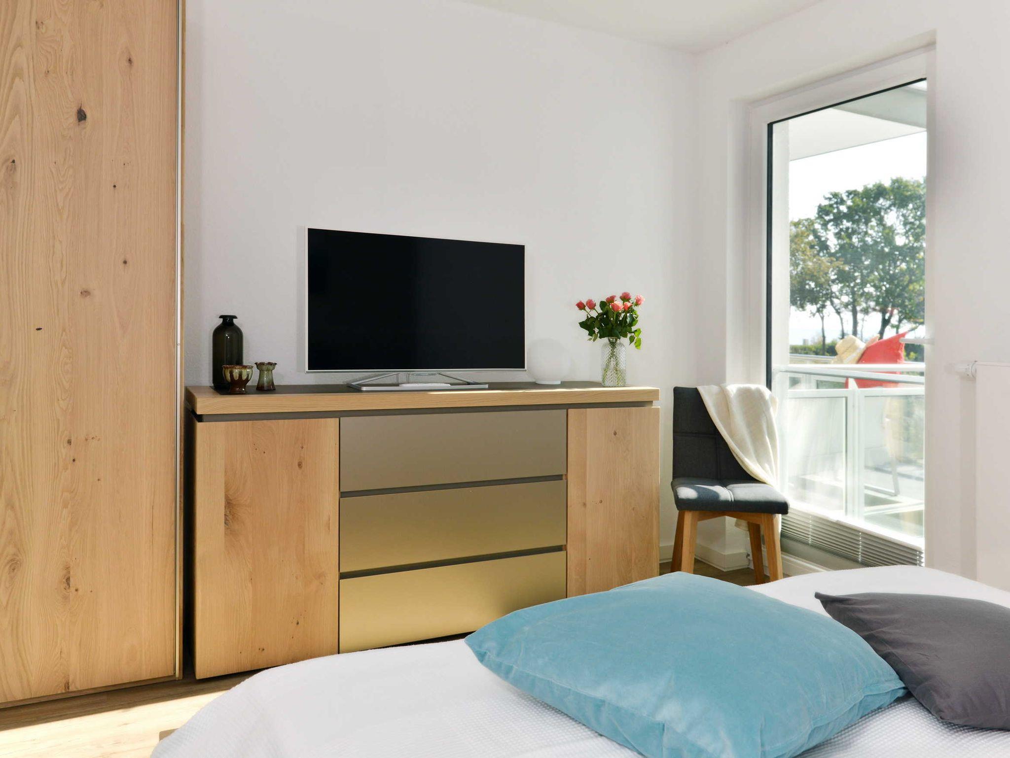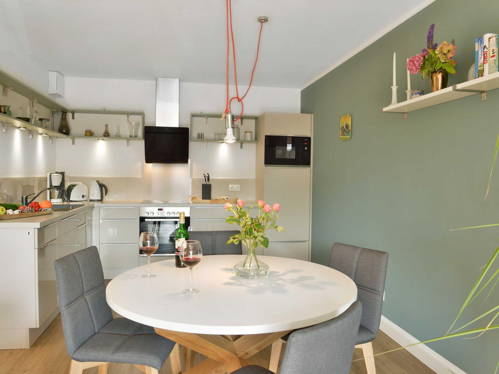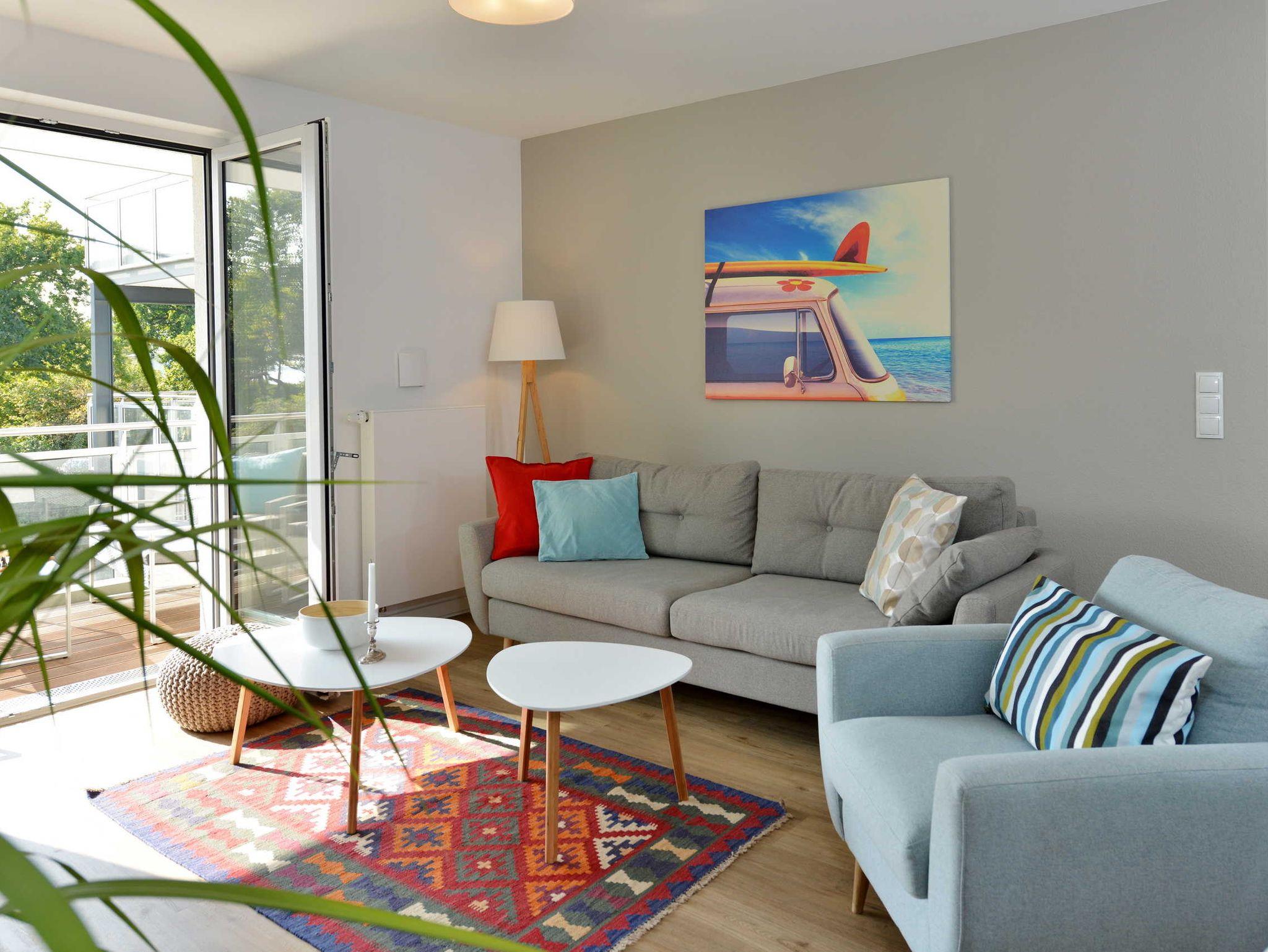 Die Strandwohnung Wassermusik ist hochwertig eingerichtet und ausgesprochen gemütlich. Das Schlafzimmer mit Echtholzmöbeln beherbergt ein großes Doppelbett. In den großzügigen Wohnbereich ist eine moderne, vollausgestattete Küche integriert, außerdem finden Sie einen Essbereich sowie eine behagliche Couchecke mit Schlaffunktion und mit großem TV-Gerät.