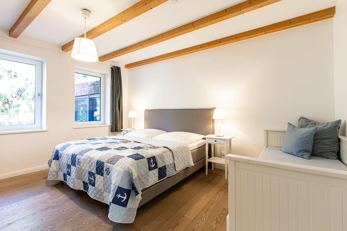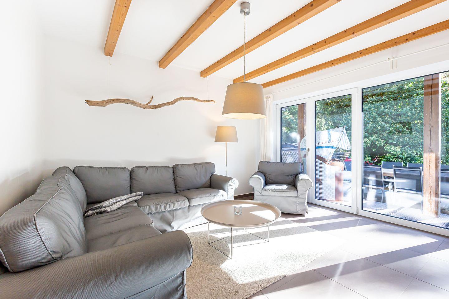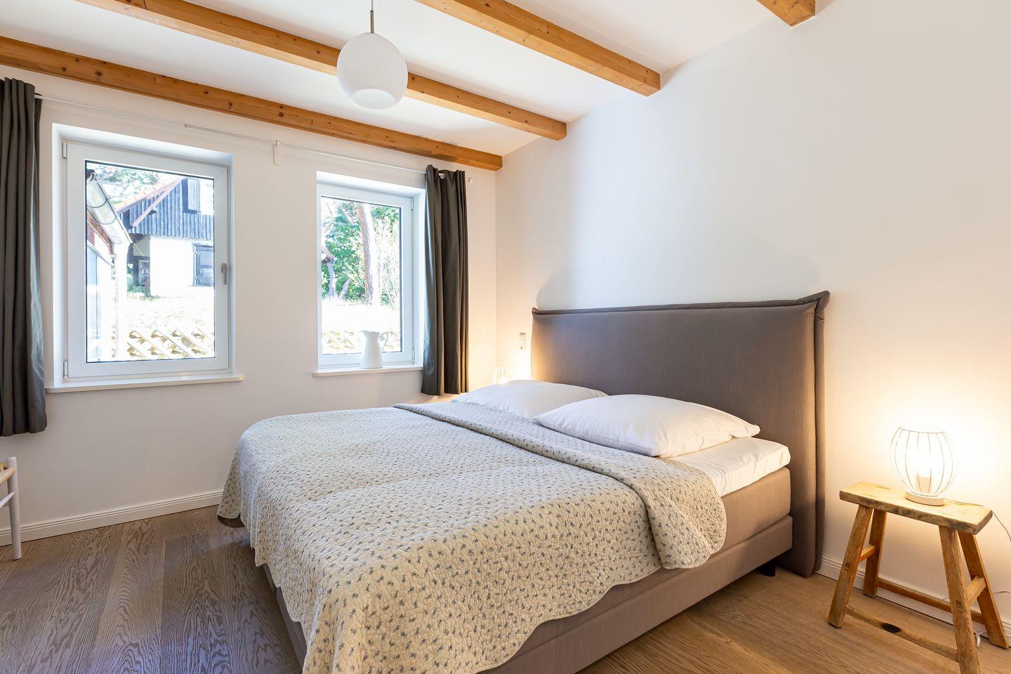 Im Erdgeschoss erwartet dich neben dem Eingangsbereich mit Garderobe der großzügig kombinierte Wohn- und Küchenbereich. Auf der linken Seite empfängt dich eine gemütliche Sitzecke mit direktem Ausblick in den Garten. Im anderen Teil des Wohnbereichs fügt sich der große und einladende Esstisch ein. Dieser bietet seinen Gästen ausreichend Platz für gesellige Stunden - ob beim Spieleabend oder beim gemeinsamen Essen. Die angrenzende Einbauküche begeistert mit klarer Formgebung und einer ausgezeichneten Ausstattung, die das Herz aller Kochbegeisterten höher schlagen lässt. Im Erdgeschoss befinden sich außerdem zwei Schlafzimmer, die mit je einem Doppelbett ausgestattet sind. In einem der beiden Schlafzimmer bietet zudem ein Kojenbett eine zusätzliche Aufbettungsmöglichkeit. Für weiteren Wohnkomfort sorgen zwei Badezimmer mit Dusche/WC auf der unteren Etage. Das Obergeschoss mit Galeriecharakter dient mit vierzig Quadratmetern als zweiter großzügiger Wohnbereich. Hier befinden sich eine gemütliche Sitzecke am Kaminofen, ein Spieltisch, ein Kicker sowie eine kleine Kinderspielecke. Du kannst von hier aus auch auf den überdachten Balkon mit Blick in den Garten gelangen. Bei der Einrichtung des Hauses ist man auf viele Gästewünsche eingegangen und hat so die Grundlage für einen vielseitigen und erholsamen Urlaub geschaffen. Das Obergeschoss beinhaltet noch insgesamt drei weitere Schlafzimmer mit zwei Doppelbetten und zwei Einzelbetten. Im Obergeschoss gibt es ein drittes Badezimmer mit Whirlwanne und Dusche/WC.