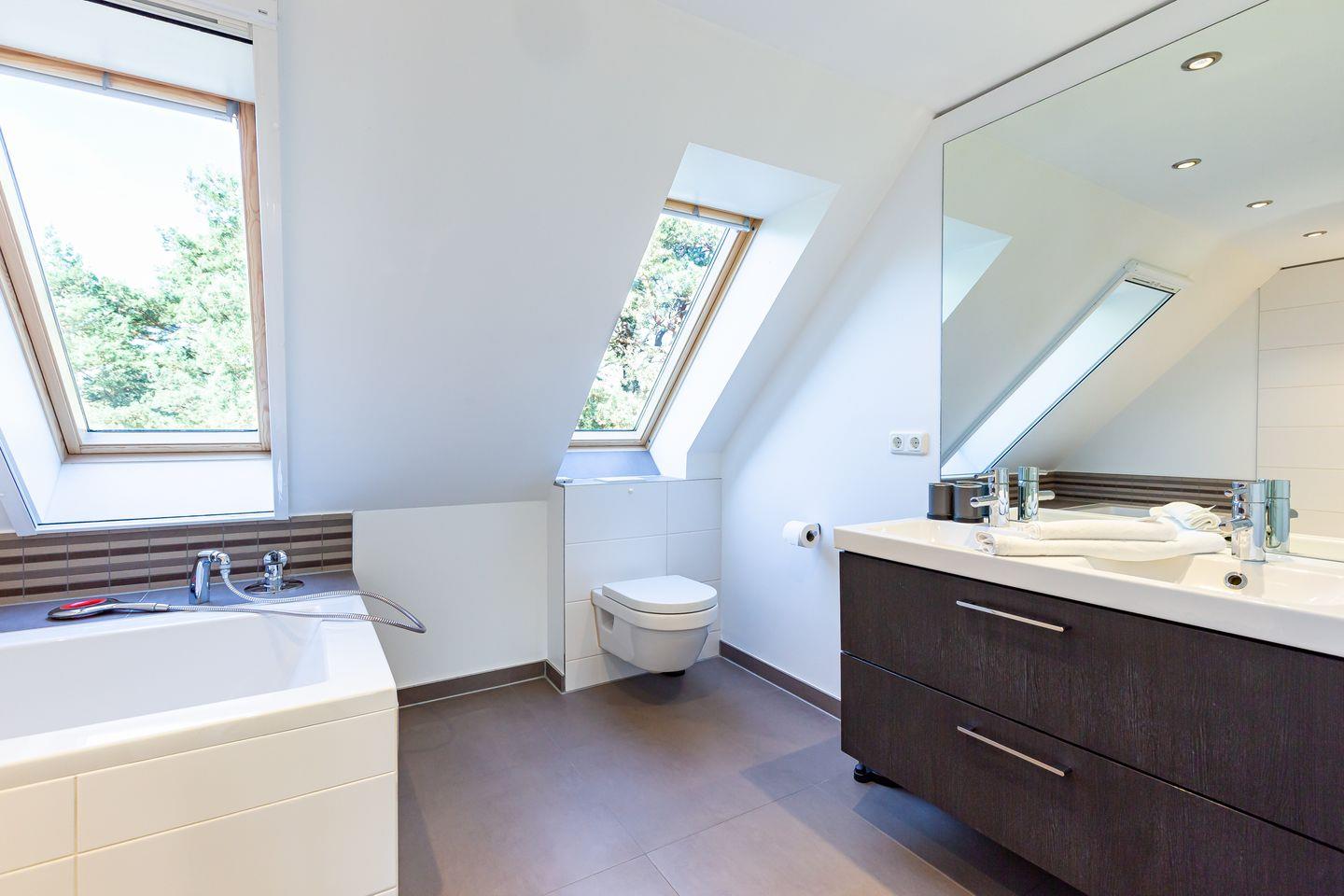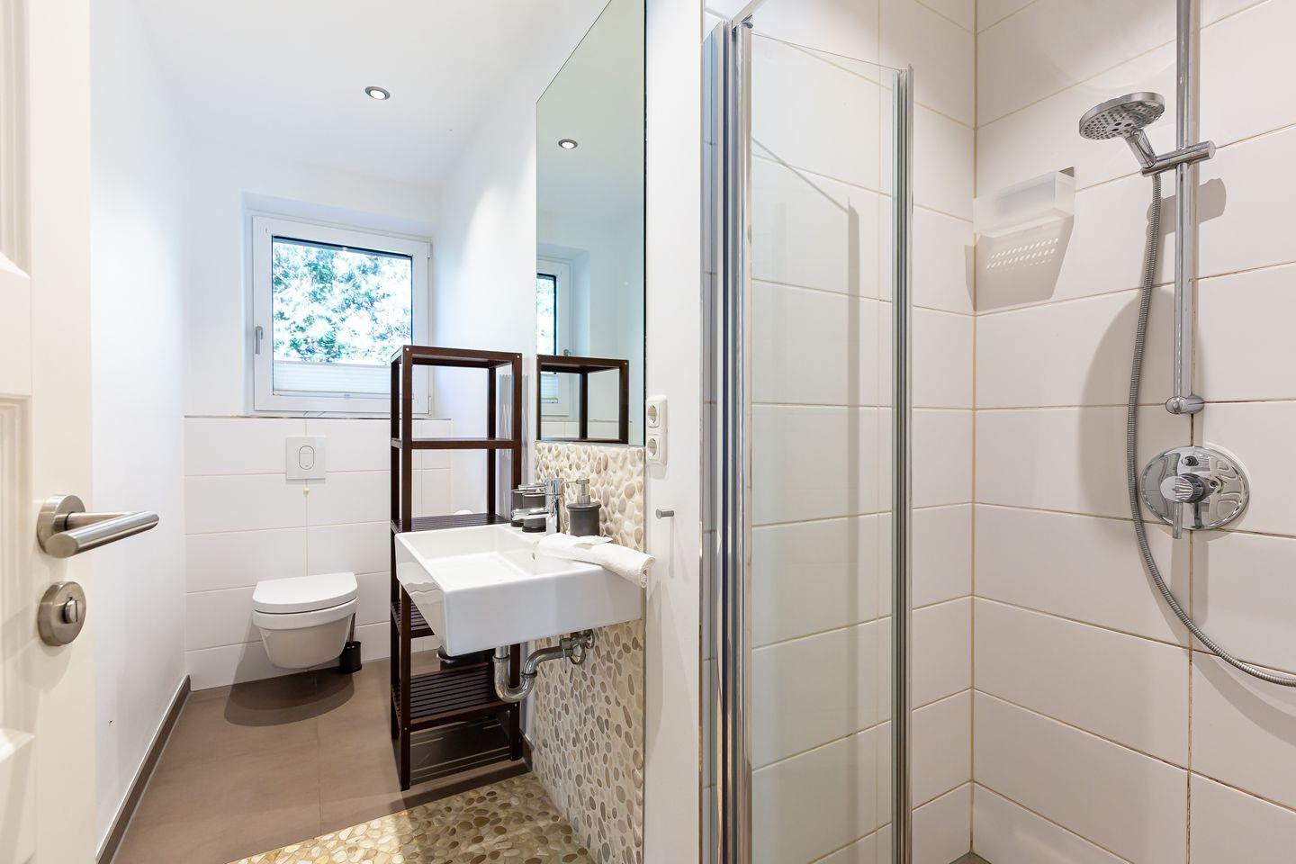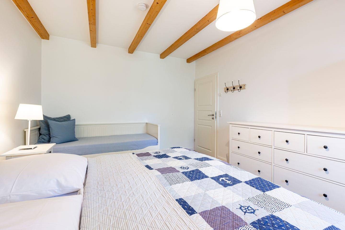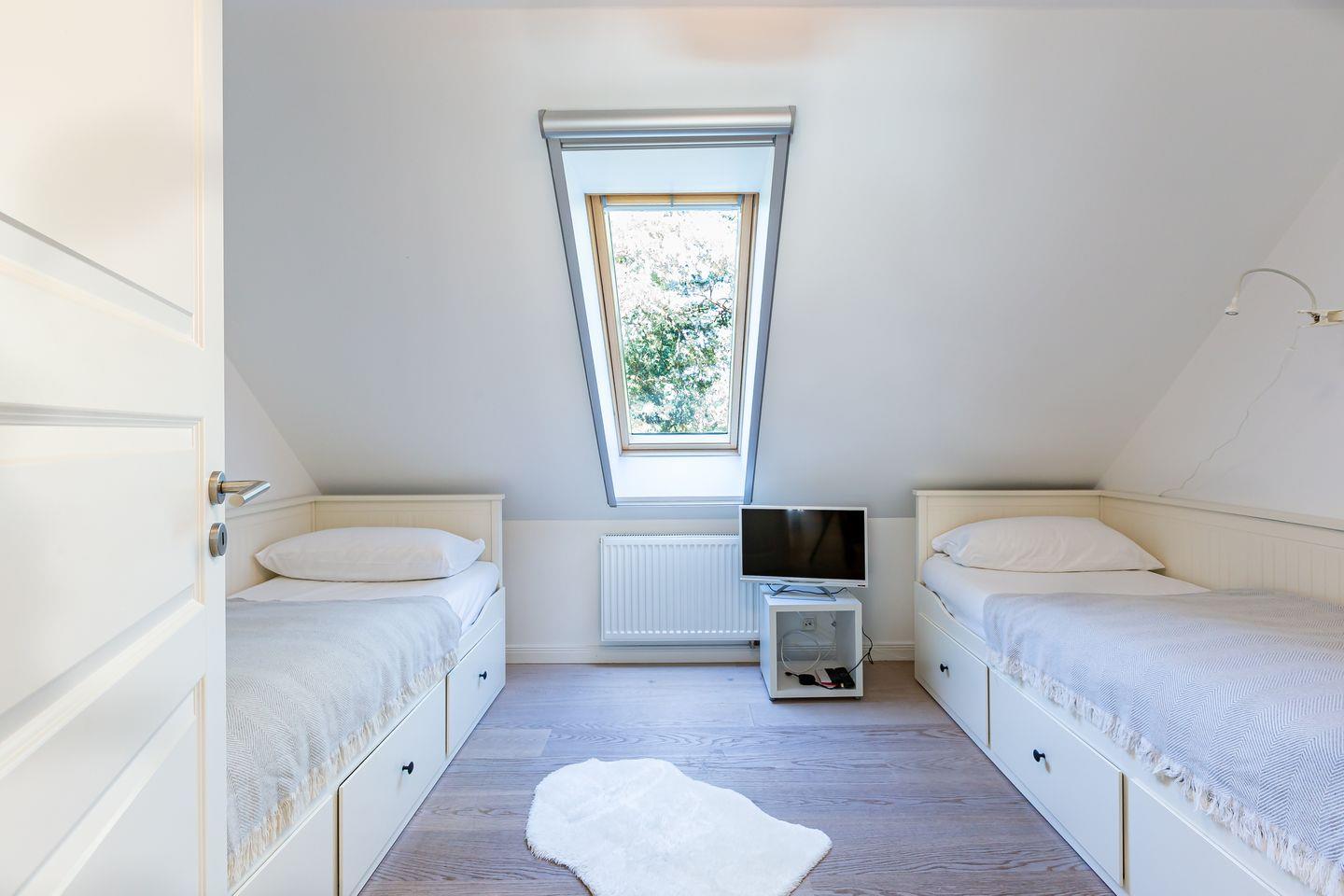 Im Erdgeschoss erwartet dich neben dem Eingangsbereich mit Garderobe der großzügig kombinierte Wohn- und Küchenbereich. Auf der linken Seite empfängt dich eine gemütliche Sitzecke mit direktem Ausblick in den Garten. Im anderen Teil des Wohnbereichs fügt sich der große und einladende Esstisch ein. Dieser bietet seinen Gästen ausreichend Platz für gesellige Stunden - ob beim Spieleabend oder beim gemeinsamen Essen. Die angrenzende Einbauküche begeistert mit klarer Formgebung und einer ausgezeichneten Ausstattung, die das Herz aller Kochbegeisterten höher schlagen lässt. Im Erdgeschoss befinden sich außerdem zwei Schlafzimmer, die mit je einem Doppelbett ausgestattet sind. In einem der beiden Schlafzimmer bietet zudem ein Kojenbett eine zusätzliche Aufbettungsmöglichkeit. Für weiteren Wohnkomfort sorgen zwei Badezimmer mit Dusche/WC auf der unteren Etage. Das Obergeschoss mit Galeriecharakter dient mit vierzig Quadratmetern als zweiter großzügiger Wohnbereich. Hier befinden sich eine gemütliche Sitzecke am Kaminofen, ein Spieltisch, ein Kicker sowie eine kleine Kinderspielecke. Du kannst von hier aus auch auf den überdachten Balkon mit Blick in den Garten gelangen. Bei der Einrichtung des Hauses ist man auf viele Gästewünsche eingegangen und hat so die Grundlage für einen vielseitigen und erholsamen Urlaub geschaffen. Das Obergeschoss beinhaltet noch insgesamt drei weitere Schlafzimmer mit zwei Doppelbetten und zwei Einzelbetten. Im Obergeschoss gibt es ein drittes Badezimmer mit Whirlwanne und Dusche/WC.