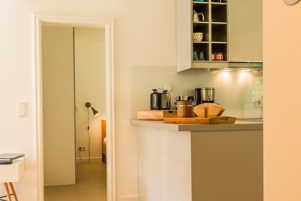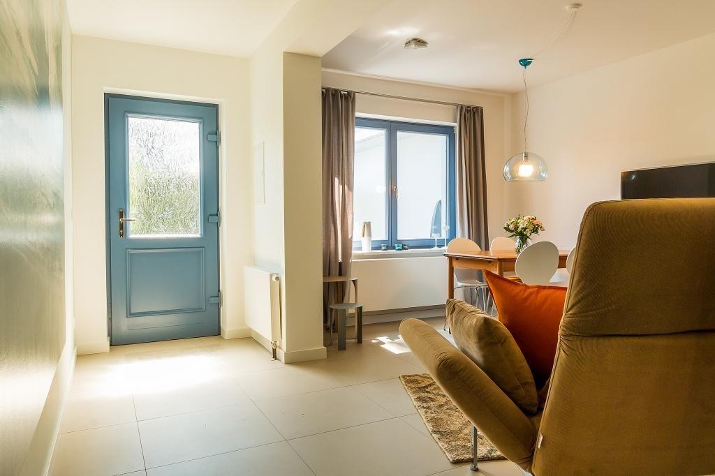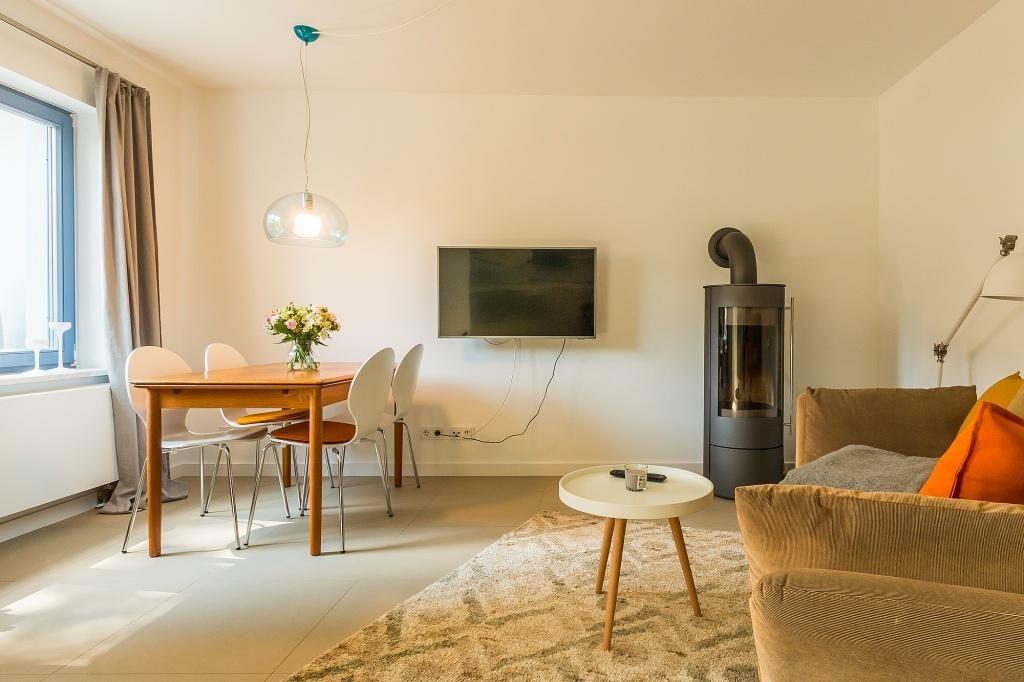 Ein heller und individuell gestalteter Flur führt dich zur Wohnung. Die moderne Erdgeschosswohnung ist im beliebten skandinavischen Stil eingerichtet und strahlt mit seinen warmen Naturtönen Wohlfühlatmosphäre aus. Ihre Ausstattung ist insgesamt neu, hochwertig und geschmackvoll. Der Wohnbereich mit seinem Sofa am Kaminofen, Rattansessel, der maritime Esstisch und die vollständig eingerichtete Küchen machen den Raum zum Mittelpunkt der Wohnung. Das Schlafzimmer ist mit einem hochwertigen Doppelbett ausgestattet. Ein Badezimmer mit Dusche/WC und Handtuchtrockner machen den Wohnkomfort für zwei Personen perfekt.