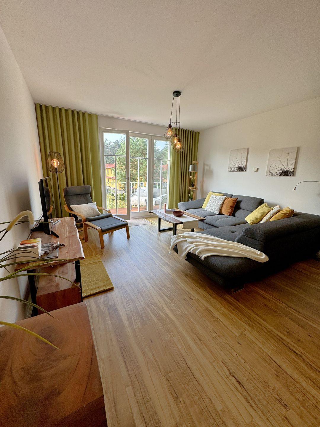 Dieses großzügige Appartement mit 74 m² befindet sich im Obergeschoss und bietet bis zu 4 Personen ausreichend Platz für einen erholsamen Urlaub. Der Süd-Balkon lädt dazu ein, die Sonne zu genießen und entspannte Stunden im Freien zu verbringen. Das geräumige Wohnzimmer ist mit einer bequemen Schlafcouch sowie einer integrierten Küchenzeile ausgestattet, die Ihnen alles bietet, was Sie für Ihre Mahlzeiten und gemeinsamen Stunden benötigen. Im Schlafzimmer sorgt ein komfortables Doppelbett für erholsamen Schlaf und einen entspannten Start in den nächsten Tag. Das Badezimmer ist mit einer Dusche und einem WC ausgestattet, um Ihren Aufenthalt so angenehm wie möglich zu gestalten. Ein Pkw-Stellplatz innerhalb der Anlage steht Ihnen zur Verfügung, sodass Sie Ihr Fahrzeug bequem parken können. Haustiere sind leider nicht gestattet, ebenso wie das Rauchen im Appartement. Für Ihre digitale Kommunikation steht Ihnen während Ihres Aufenthalts kostenfreies W-LAN zur Verfügung.