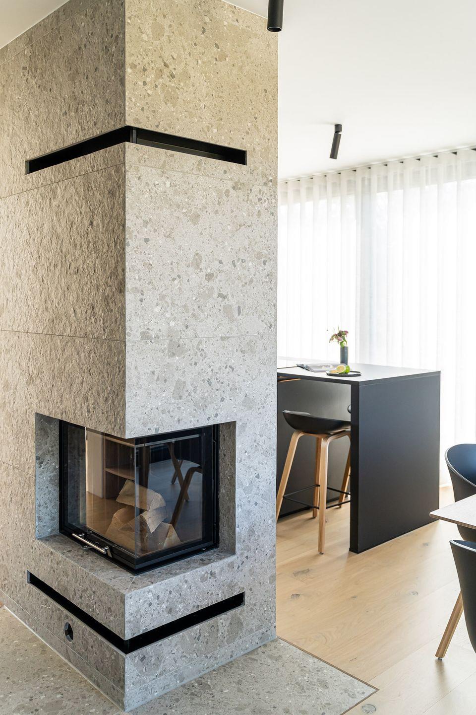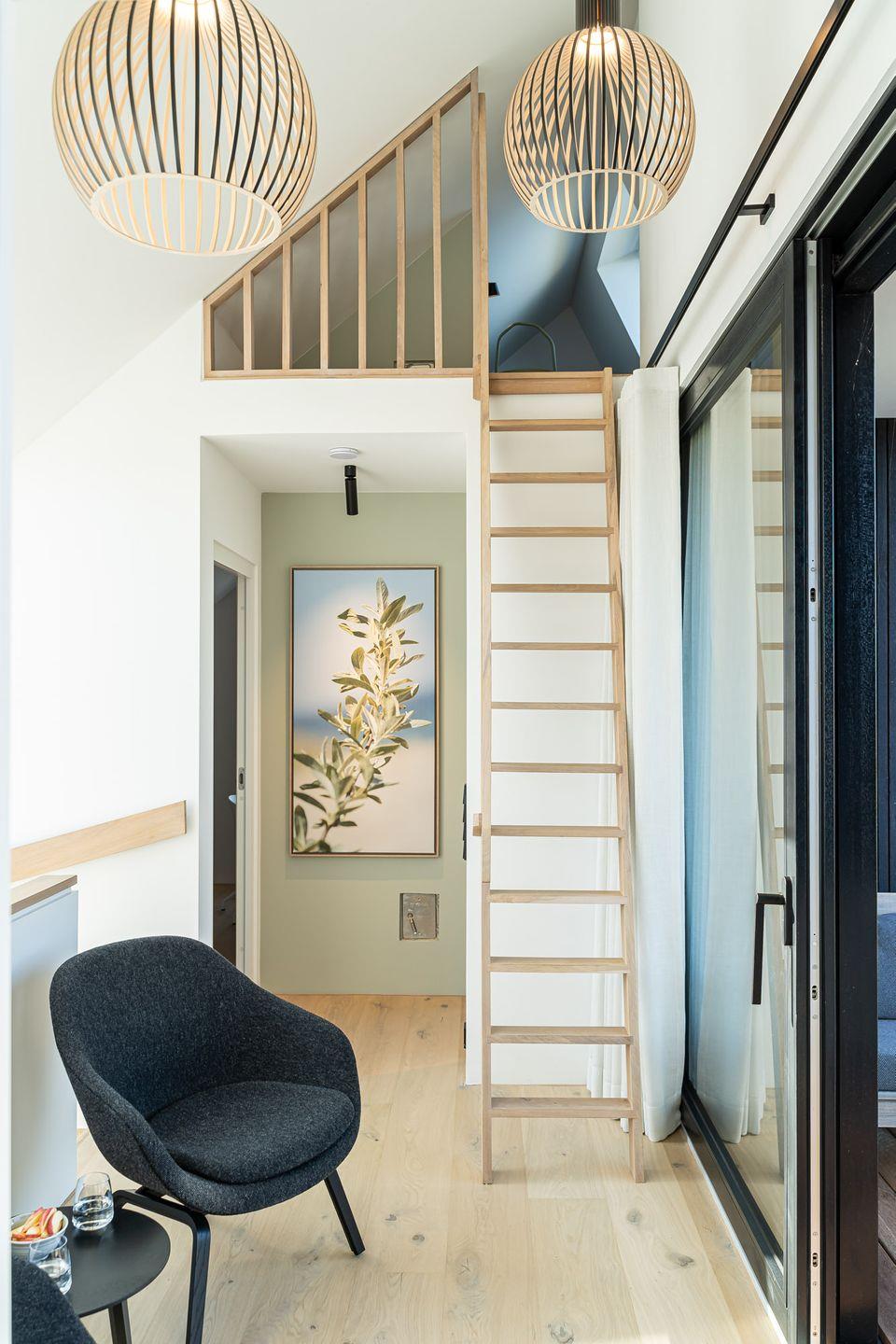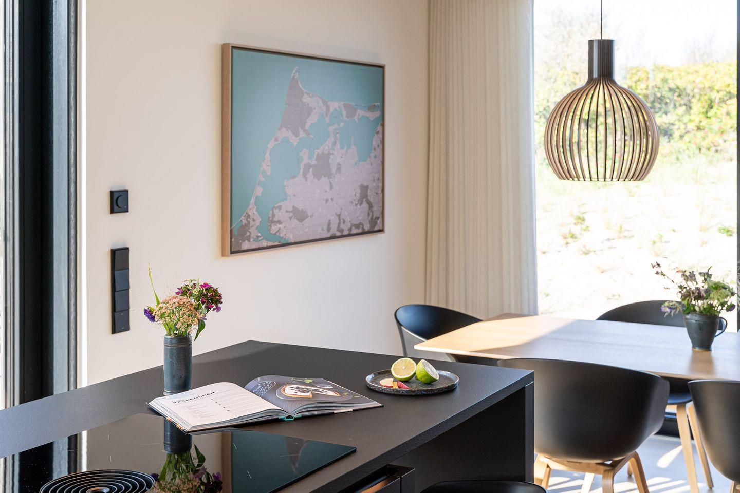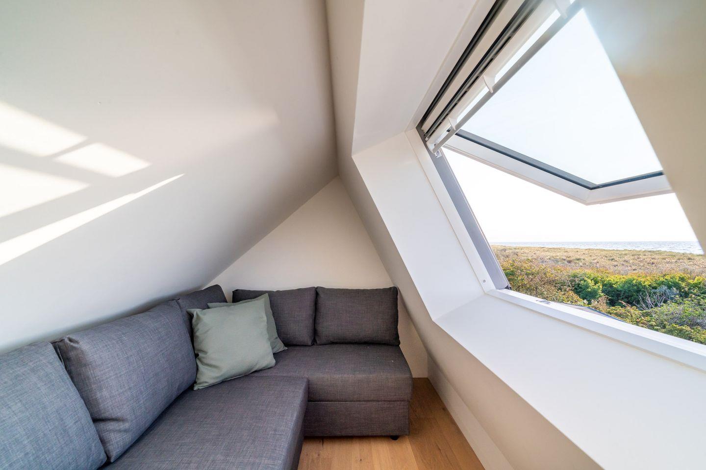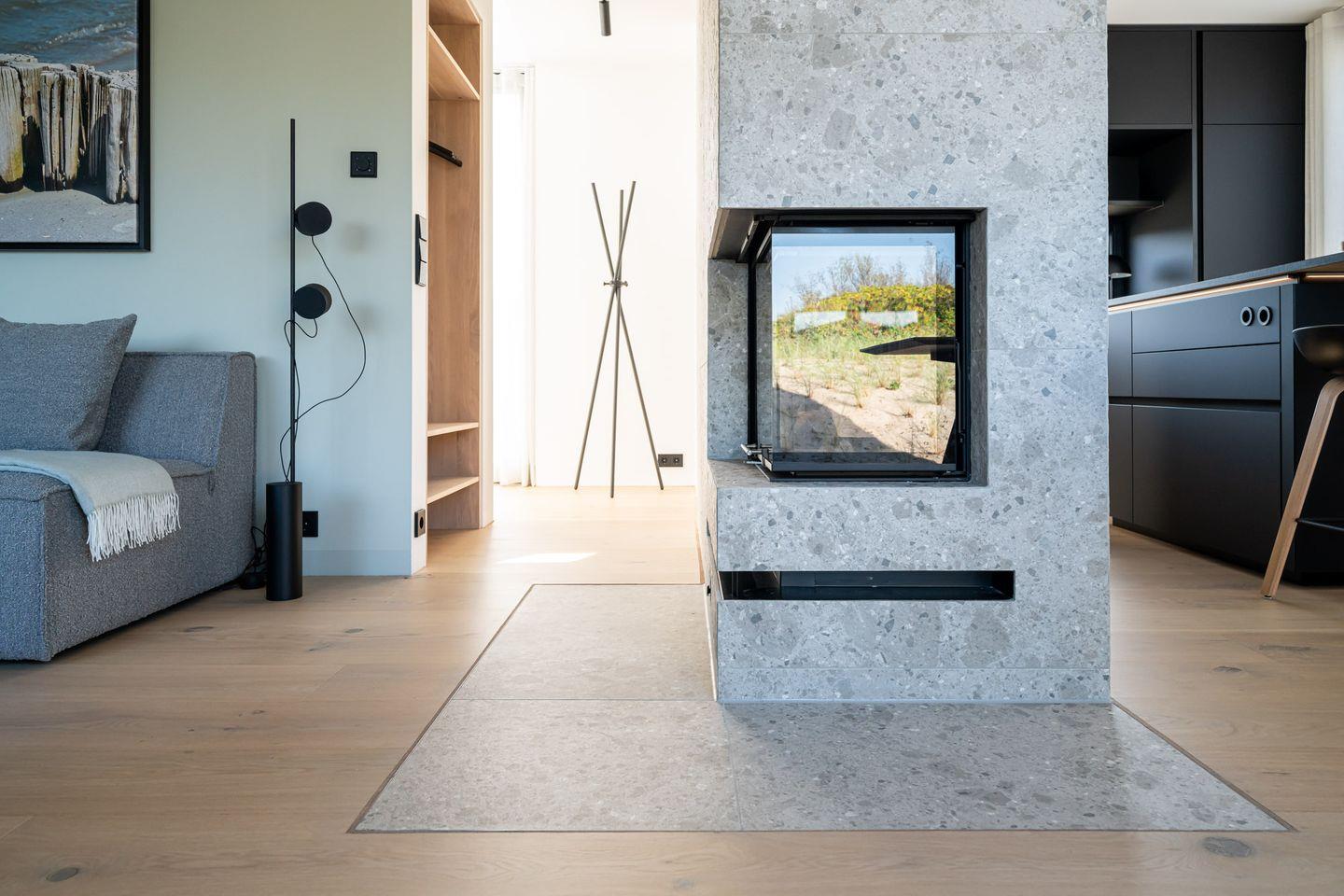 Das Dünenhaus verbindet Design, Natur und Komfort auf besondere Weise. Von der Loggia eröffnet sich ein weiter Blick über die Ostsee. Auch von der großzügigen Terrasse aus lässt sich die Meeresluft unmittelbar spüren. Im Wohnbereich sorgt der Kamin für eine ruhige, warme Atmosphäre – besonders stimmungsvoll nach langen Strandtagen.