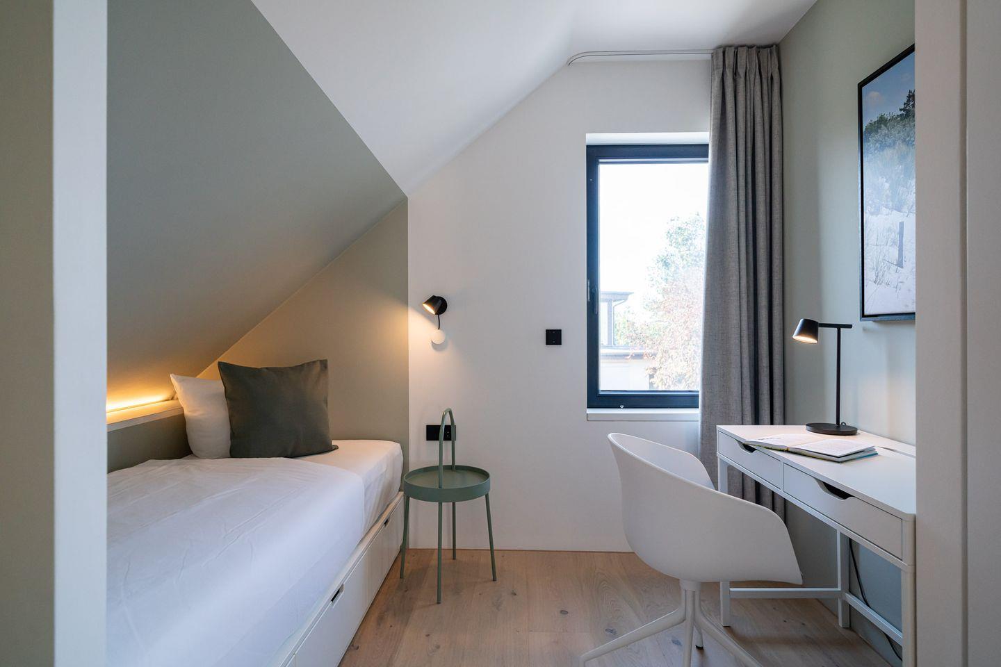 Das Ferienhaus in Dierhagen bietet in drei Schlafzimmern Platz für bis zu 6 Personen. Zwei Doppelbetten (180 × 210 cm) sowie zwei Einzelbetten (90 × 200 cm) schaffen großzügige Rückzugsräume. Stilvolle Möbel aus Eiche treffen auf schwarze Details wie Lichtschalter, Steckdosen und Griffe – ein bewusst reduziertes, elegantes Gestaltungskonzept.