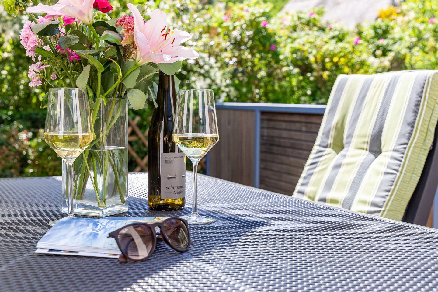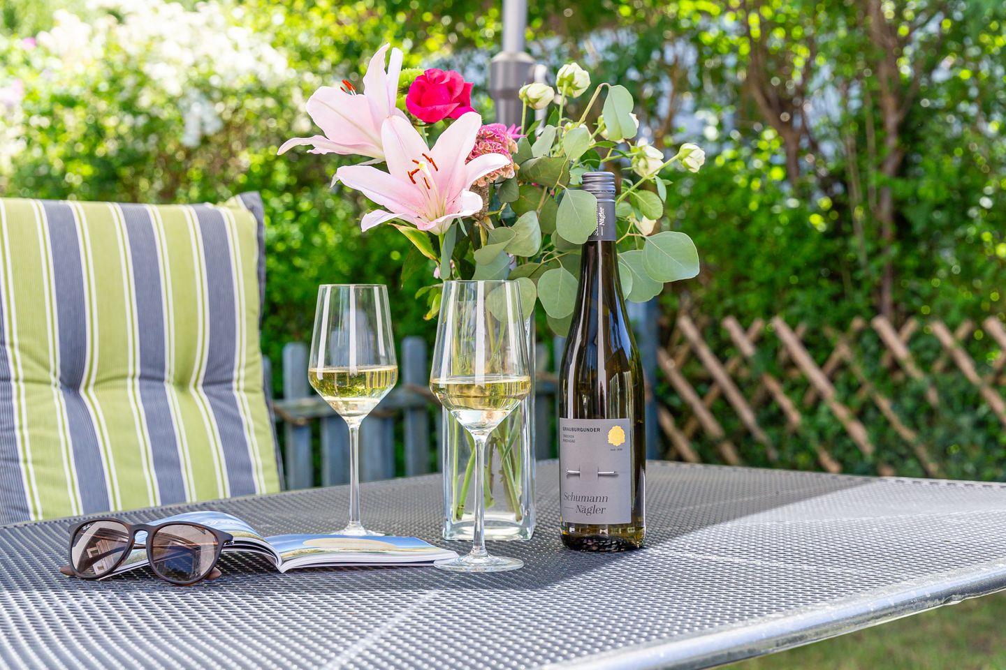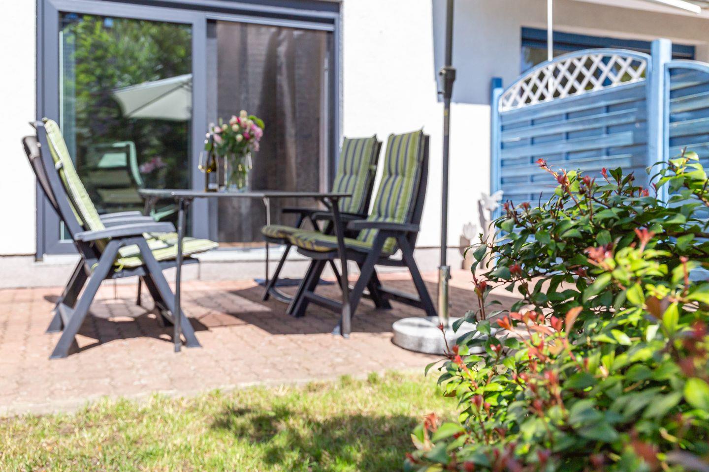 Im Außenbereich steht ein kleiner und komplett eingefriedeter Garten mit Bestuhlung und Sonnenschirm zur Verfügung. Perfekt, um das Frühstück unter freiem Himmel zu genießen oder die lauen Sommerabende draußen ausklingen zu lassen. Zur Ferienwohnung gehört ein PKW-Stellplatz vor dem Haus.