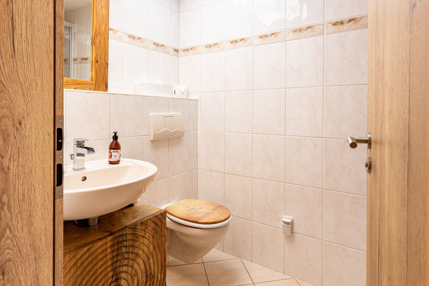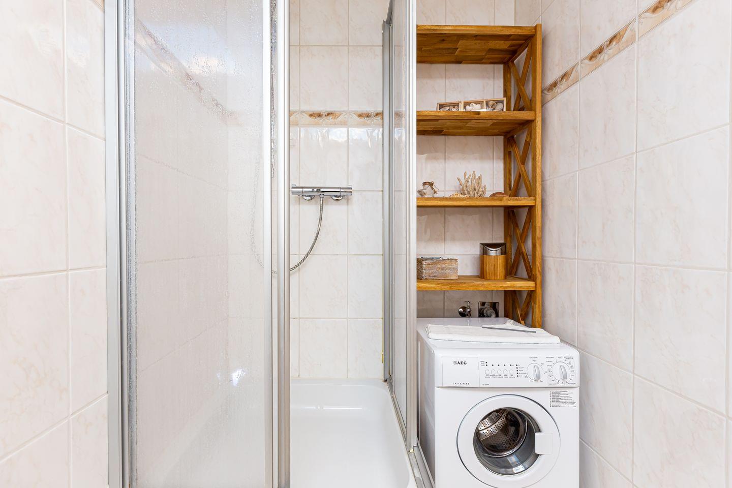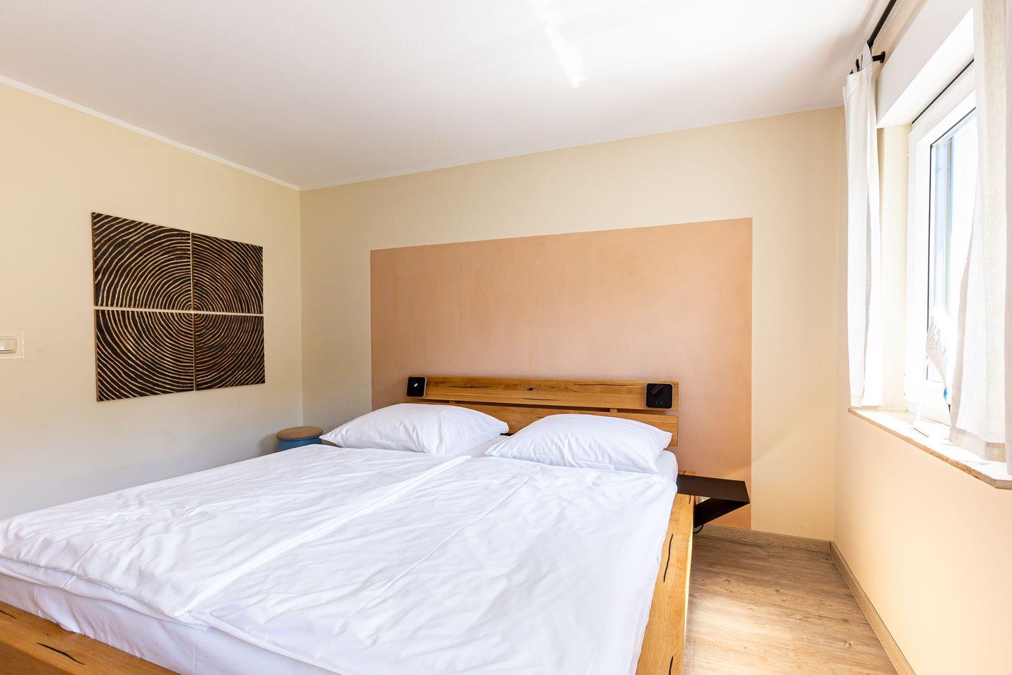 Über die Treppe gelangt man in den ersten Stock und in die beiden Schlafzimmer der Wohnung. Beide sind mit einem hochwertigen Doppelbett, Kleiderschrank und Vorhängen ausgestattet, so dass man hier den erholsamen Schlaf und heimeligen Rückzugsort bekommt, den man sich im Urlaub wünscht. Für noch mehr Wohnkomfort verfügt auch diese Etage über ein Bad mit Dusche, WC und Waschmaschine.