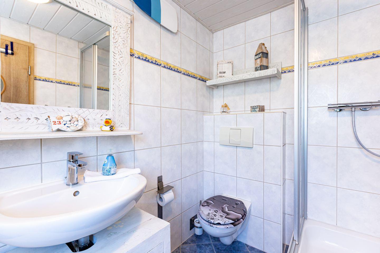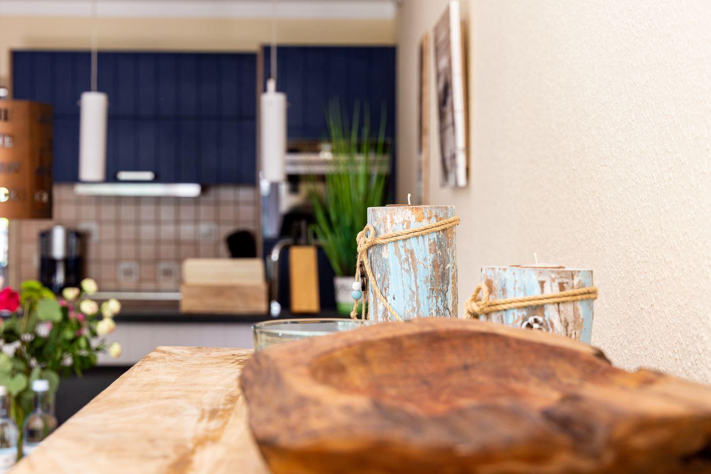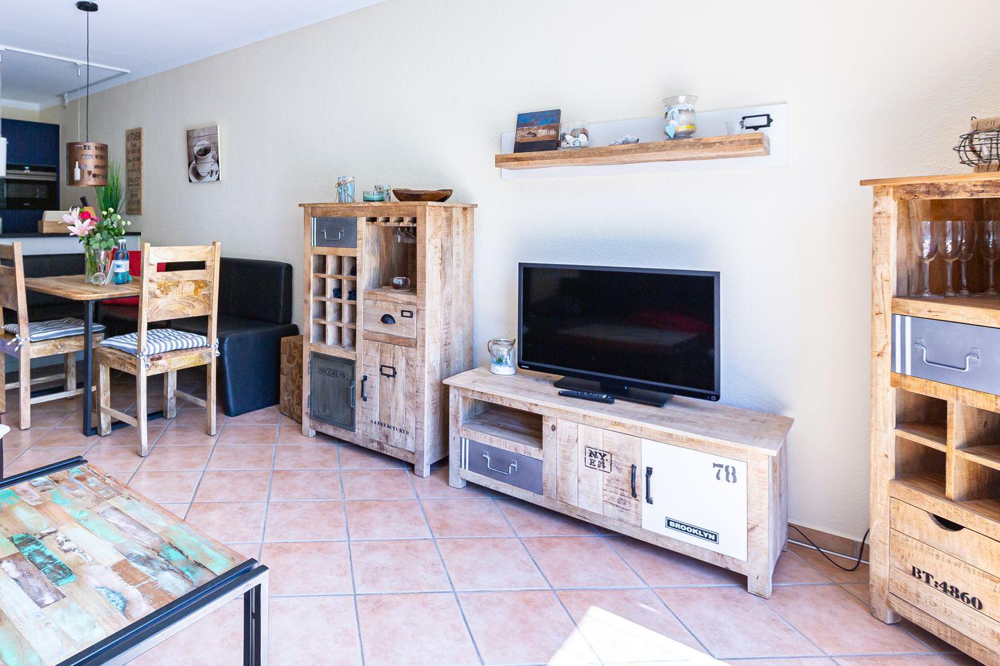 Mittelpunkt der Wohnung ist der großzügige und gemütlich eingerichtete Wohn- und Küchenbereich. Mit dem Sofa am Kamin, dem Esstisch und der voll ausgestatteten Küchenzeile lässt es sich hier nach Herzenslust kochen und klönen. Holzmöbel und helle Farben schaffen zudem eine warme Wohnatmosphäre – ebenso wie die Sonne, die dank der bodentiefen Fenster den Raum mit Licht flutet. Ein Tageslichtbad mit Dusche und WC sowie der Flur mit Garderobe runden das Erdgeschoss ab.