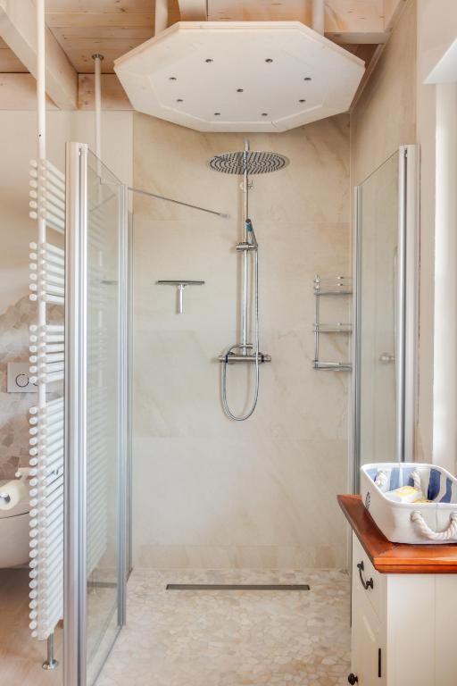 Im Tageslichtbad mit Fenster stehen Ihnen eine bodengleiche Dusche, eine Badewanne sowie ein Haartrockner zur Verfügung. Für kleinere Gäste gibt es einen Kinderhochstuhl.