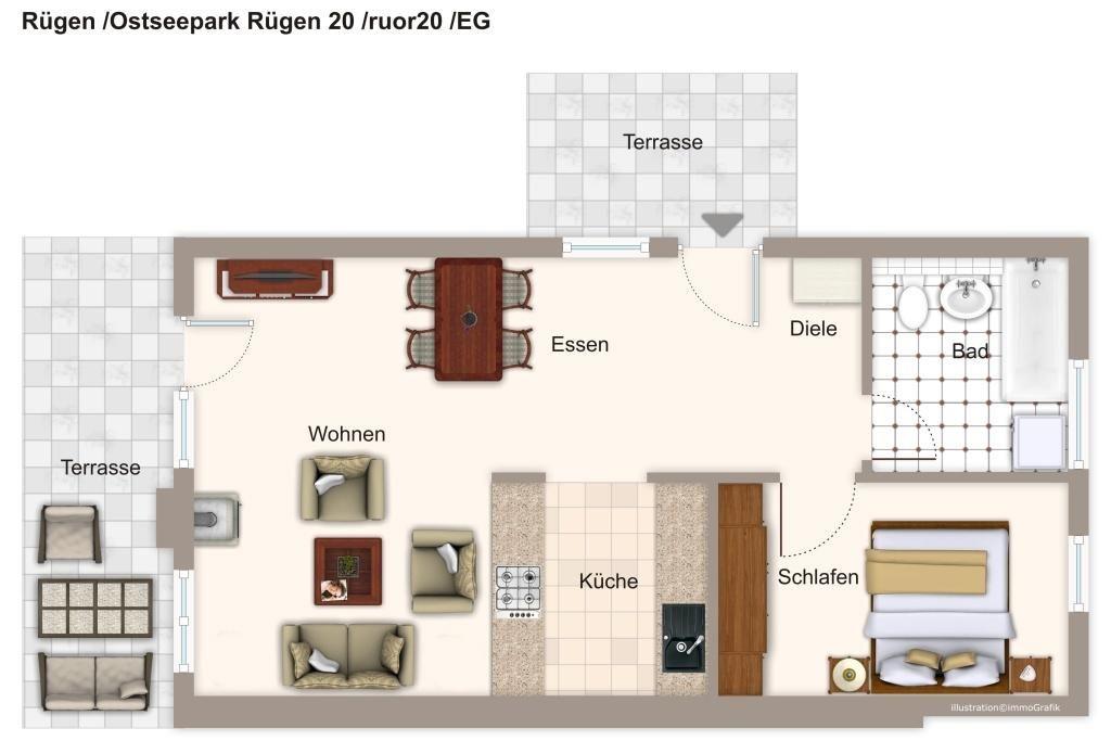 Das Apartment befindet sich auf der Südseite der Ferienhausanlage in Glowe und liegt im Erdgeschoss. Den Ostseestrand erreicht ihr in ca. 700 m.