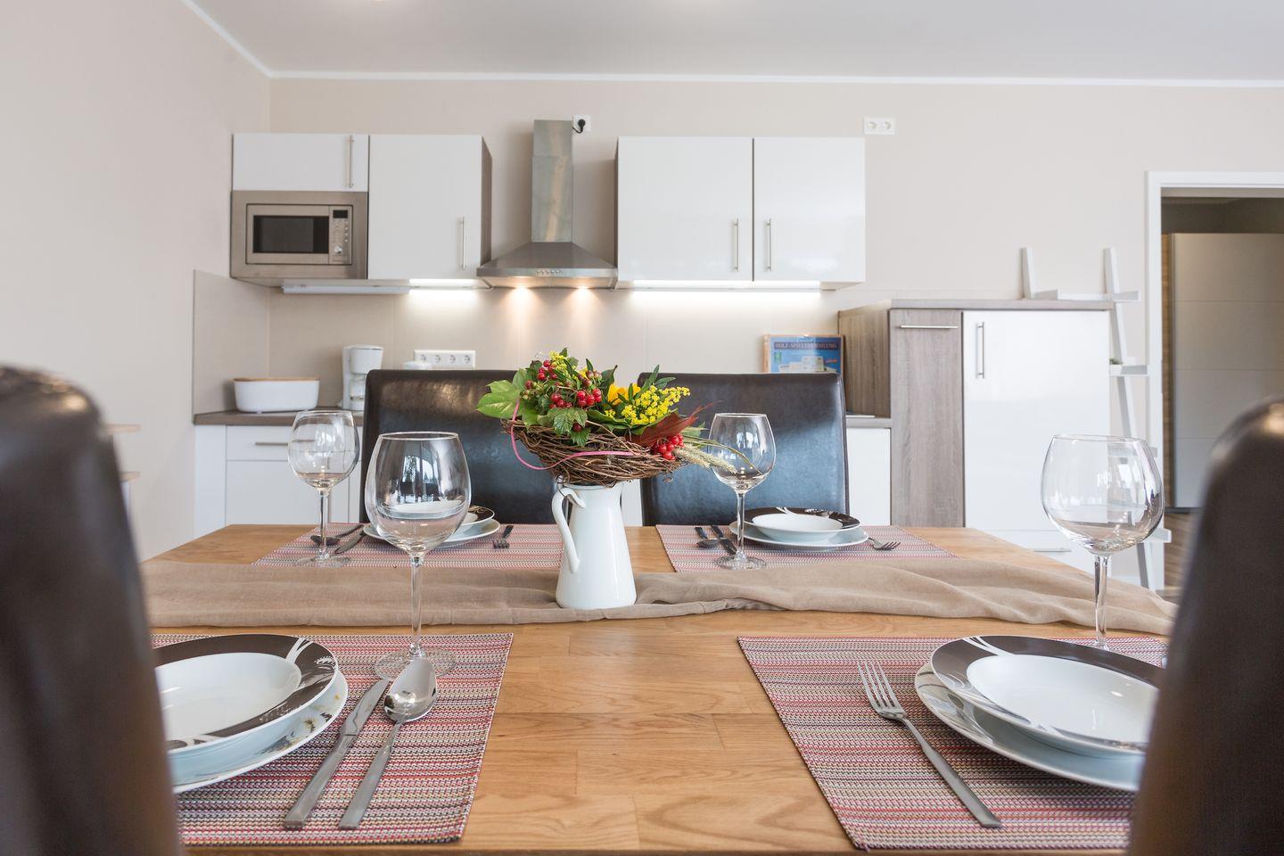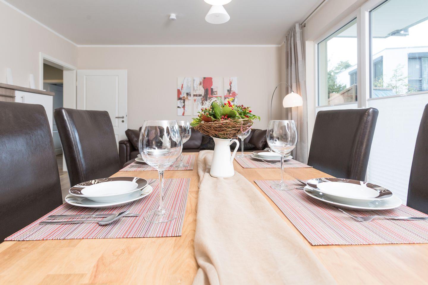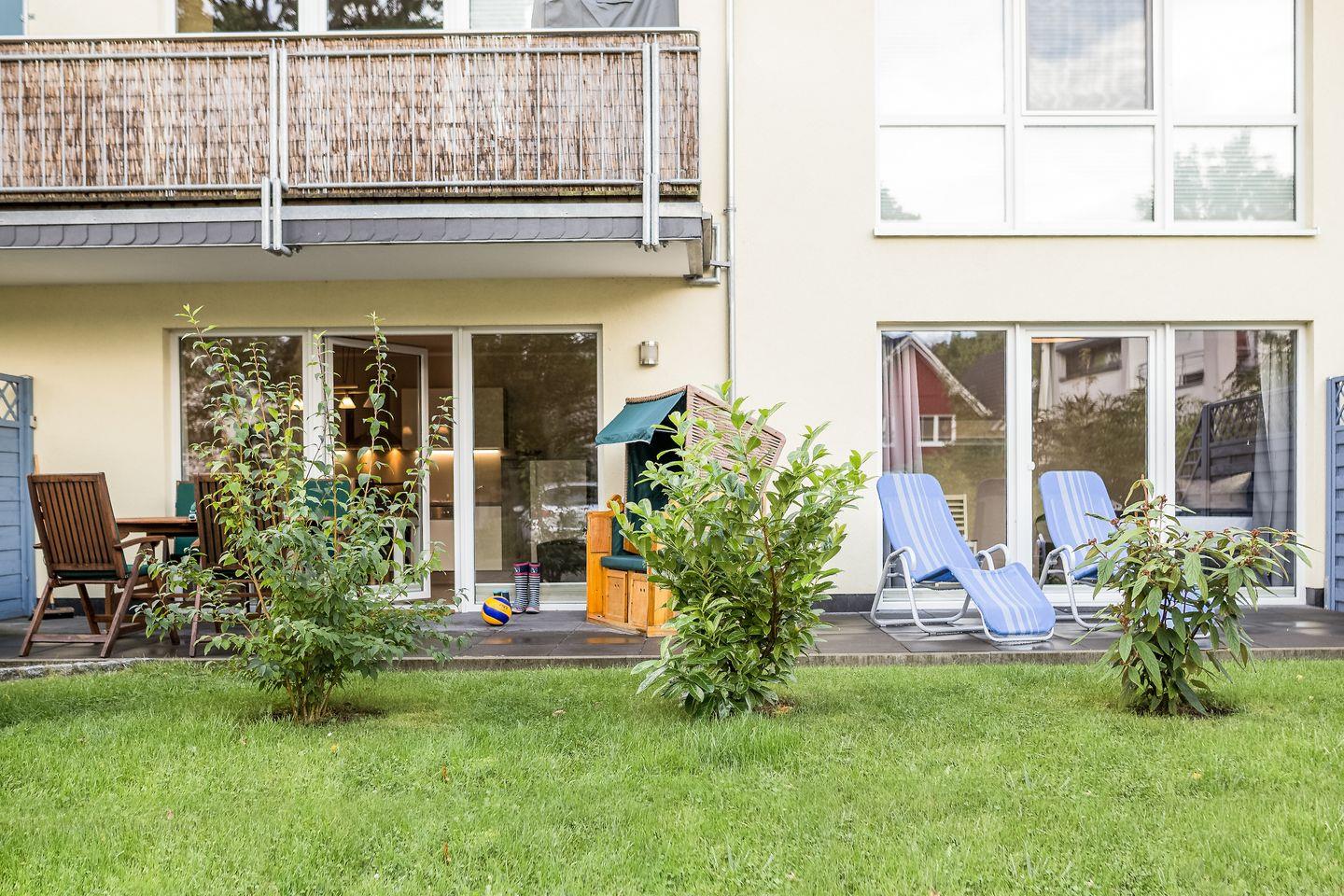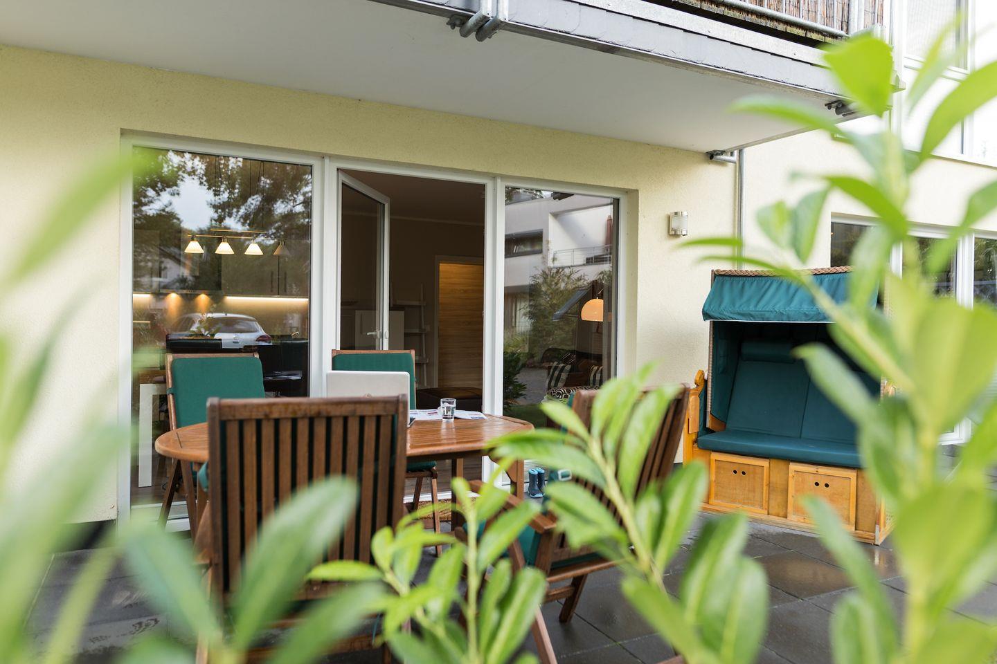 Die helle und gemütliche Ferienwohnung "Strandnah" für bis zu 5 Personen befindet sich, wie der Name sagt, in unmittelbarer Strandnähe im Erdgeschoss des neu erbauten Hauses. Sie betreten das freundliche Appartement über den Flur und gelangen von hier aus in den großzügigen und hellen Wohnbereich mit bequemer Sitzecke, einem Essbereich mit Flachbildfernseher und integrierter Küchenzeile. Die voll ausgestattete Küche umfasst neben diversen Kochutensilien, genügend Geschirr und Besteck natürlich auch einen Ceranherd mit Backofen, einen Kühlschrank mit Gefriermöglichkeit, eine Geschirrspülmaschine und eine Mikrowelle. Der Esstisch ist groß und bietet Ihnen genügend Platz für ausgiebige Mahlzeiten. Über das Wohnzimmer gelangen Sie direkt auf die angrenzende Terrasse mit Sitzgelegenheiten und eigenem Strandkorb. Genießen Sie hier Ihren Start in den Tag bei einem ausgiebigen Frühstück oder lassen Sie den Abend bei einem Glas Wein ausklingen. Meeresrauschen ist garantiert! Die Schlafmöglichkeiten der Wohnung verteilen sich auf ein geräumiges Elternschlafzimmer mit Boxspringdoppelbett, ein Kinderschlafzimmer mit zwei einzelnen Boxspringbetten und einem weiteren Flachbildfernseher sowie einer Couch im Wohnzimmer für 1 Person. Im modernen Badezimmer gibt es eine geräumige, ebenerdige Dusche, ein Waschbecken, einen Haartrockner und natürlich ein WC. Da sich die gesamte Wohnung barrierearm im Erdgeschoss befindet, ist das Appartement zwar nicht rollstuhlgerecht aber dennoch für Rollstuhlfahrer geeignet. Für Ihren unbeschwerten Familienurlaub steht im Appartement außerdem kostenloses WLAN, eine Radio sowie ein DVD Player zur Verfügung. Ihre Haustier sind gegen eine zusätzliche Gebühr herzlich willkommen. Die Ostsee befindet sich nur etwa 80 m entfernt und ist ganz einfach und bequem zu Fuß, ohne lästiges Parkplatz suchen zu erreichen.