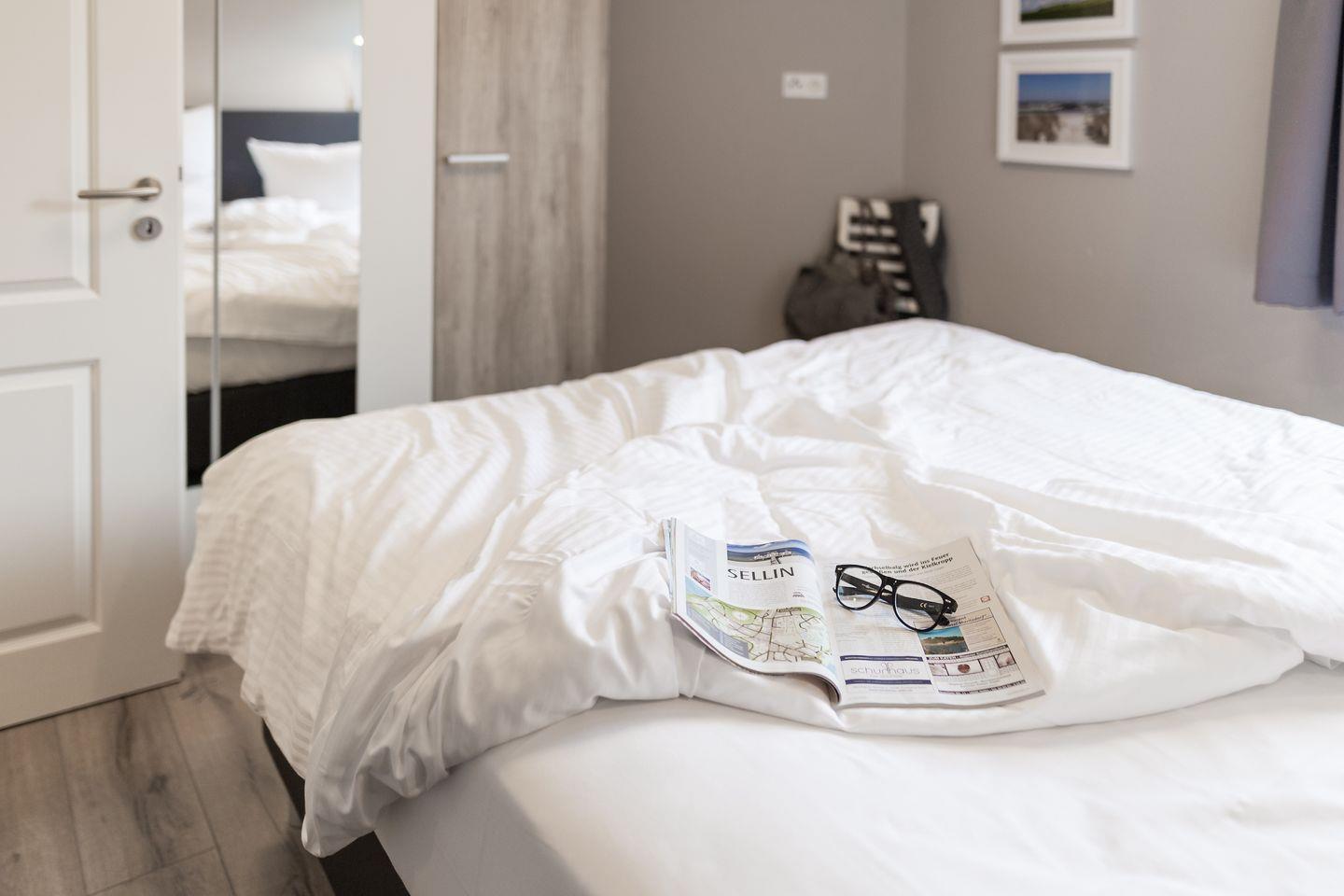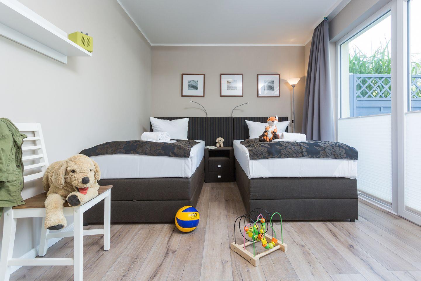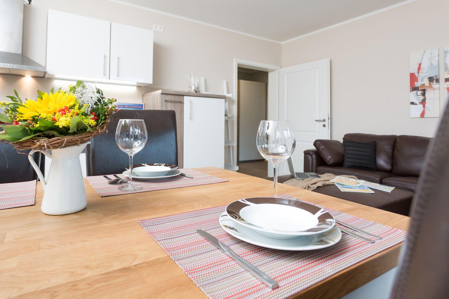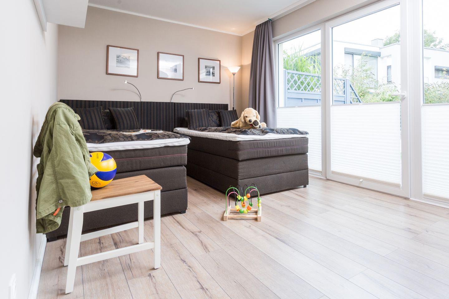 Die helle und gemütliche Ferienwohnung "Strandnah" für bis zu 5 Personen befindet sich, wie der Name sagt, in unmittelbarer Strandnähe im Erdgeschoss des neu erbauten Hauses. Sie betreten das freundliche Appartement über den Flur und gelangen von hier aus in den großzügigen und hellen Wohnbereich mit bequemer Sitzecke, einem Essbereich mit Flachbildfernseher und integrierter Küchenzeile. Die voll ausgestattete Küche umfasst neben diversen Kochutensilien, genügend Geschirr und Besteck natürlich auch einen Ceranherd mit Backofen, einen Kühlschrank mit Gefriermöglichkeit, eine Geschirrspülmaschine und eine Mikrowelle. Der Esstisch ist groß und bietet Ihnen genügend Platz für ausgiebige Mahlzeiten. Über das Wohnzimmer gelangen Sie direkt auf die angrenzende Terrasse mit Sitzgelegenheiten und eigenem Strandkorb. Genießen Sie hier Ihren Start in den Tag bei einem ausgiebigen Frühstück oder lassen Sie den Abend bei einem Glas Wein ausklingen. Meeresrauschen ist garantiert! Die Schlafmöglichkeiten der Wohnung verteilen sich auf ein geräumiges Elternschlafzimmer mit Boxspringdoppelbett, ein Kinderschlafzimmer mit zwei einzelnen Boxspringbetten und einem weiteren Flachbildfernseher sowie einer Couch im Wohnzimmer für 1 Person. Im modernen Badezimmer gibt es eine geräumige, ebenerdige Dusche, ein Waschbecken, einen Haartrockner und natürlich ein WC. Da sich die gesamte Wohnung barrierearm im Erdgeschoss befindet, ist das Appartement zwar nicht rollstuhlgerecht aber dennoch für Rollstuhlfahrer geeignet. Für Ihren unbeschwerten Familienurlaub steht im Appartement außerdem kostenloses WLAN, eine Radio sowie ein DVD Player zur Verfügung. Ihre Haustier sind gegen eine zusätzliche Gebühr herzlich willkommen. Die Ostsee befindet sich nur etwa 80 m entfernt und ist ganz einfach und bequem zu Fuß, ohne lästiges Parkplatz suchen zu erreichen.