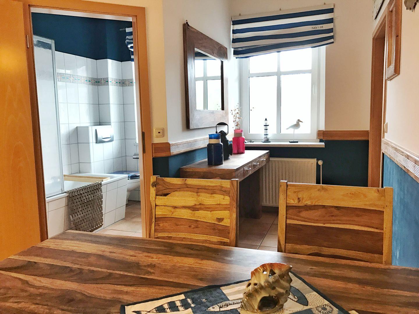 Das maritim eingerichtete Appartement bietet Ihnen Schlafmöglichkeiten für bis zu 4 Personen, die sich auf ein geräumiges Schlafzimmer mit Doppelbett sowie auf eine Schlafcouch im Wohnzimmer verteilen. Der behagliche Wohnbereich der ca. 60 m² großen Ferienwohnung mit vorgelagertem Balkon verfügt neben der Schlafcouch außerdem über 2 Sessel, einen Flachbildfernseher und eine Musikanlage. Die separate Küche ist mit einer großen Essecke und einer Küchenzeile mit Geschirrspüler, Kaffeemaschine, Mikrowelle, Toaster, Wasserkocher, Backofen und Kühlschrank ausgestattet. Im hellen Tageslichtbadezimmer finden Sie neben einem WC und Waschbecken eine Badewanne mit Duschmöglichkeit.