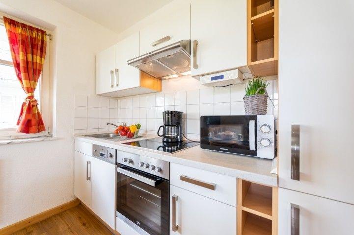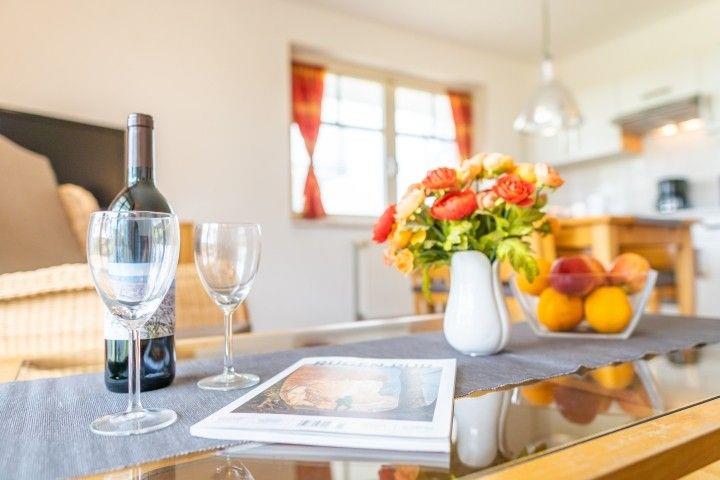 Die Wohnung ist im guten Standard mit hellen Holzmöbeln eingerichtet. Im Wohnbereich gibt es neben einer Sofaecke mit Flachbild-TV eine integrierte Einbauküche mit Kühlschrank, Geschirrspüler, Backofen, Ceranfeld, Kaffeemaschine, Wasserkocher, Geschirr und Besteck einen Esstisch.