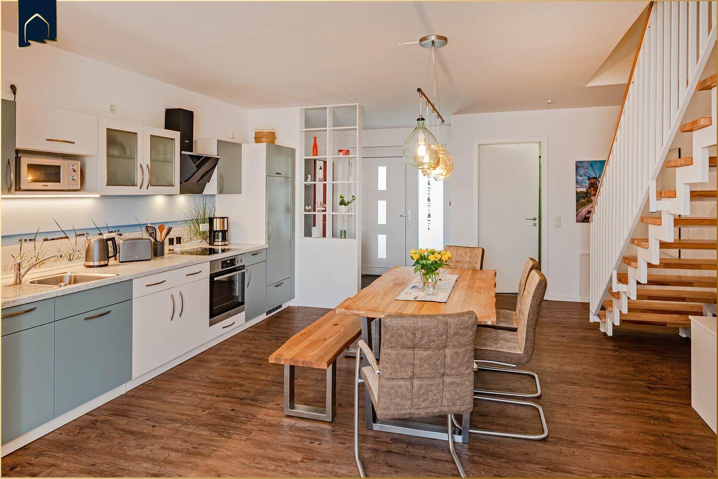 Willkommen in Ihrem modernen Urlaubsdomizil – einem stilvollen Ferienhaus, das mit großzügigen 94?m² Wohnfläche, lichtdurchfluteten Räumen und einer hochwertigen Ausstattung überzeugt. Ob mit der Familie oder zu zweit – hier finden bis zu sechs Gäste Platz zum Entspannen. Das Haus verfügt über zwei komfortable Schlafzimmer, zwei moderne Bäder mit Dusche und eine vollständig ausgestattete Küche inklusive Backofen, Mikrowelle, Kühlschrank und Gefrierfach. WLAN, zwei Fernseher und eine gemütliche Sofaecke sorgen für Unterhaltung und Komfort. Ein besonderes Plus ist die Fußbodenheizung, die das ganze Jahr über ein behagliches Wohngefühl garantiert.