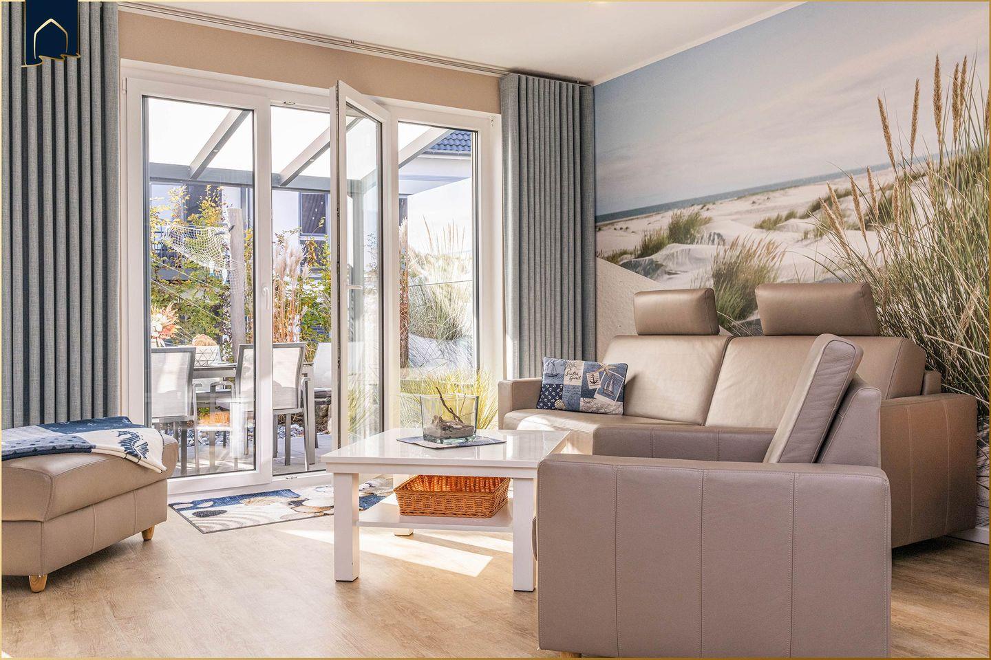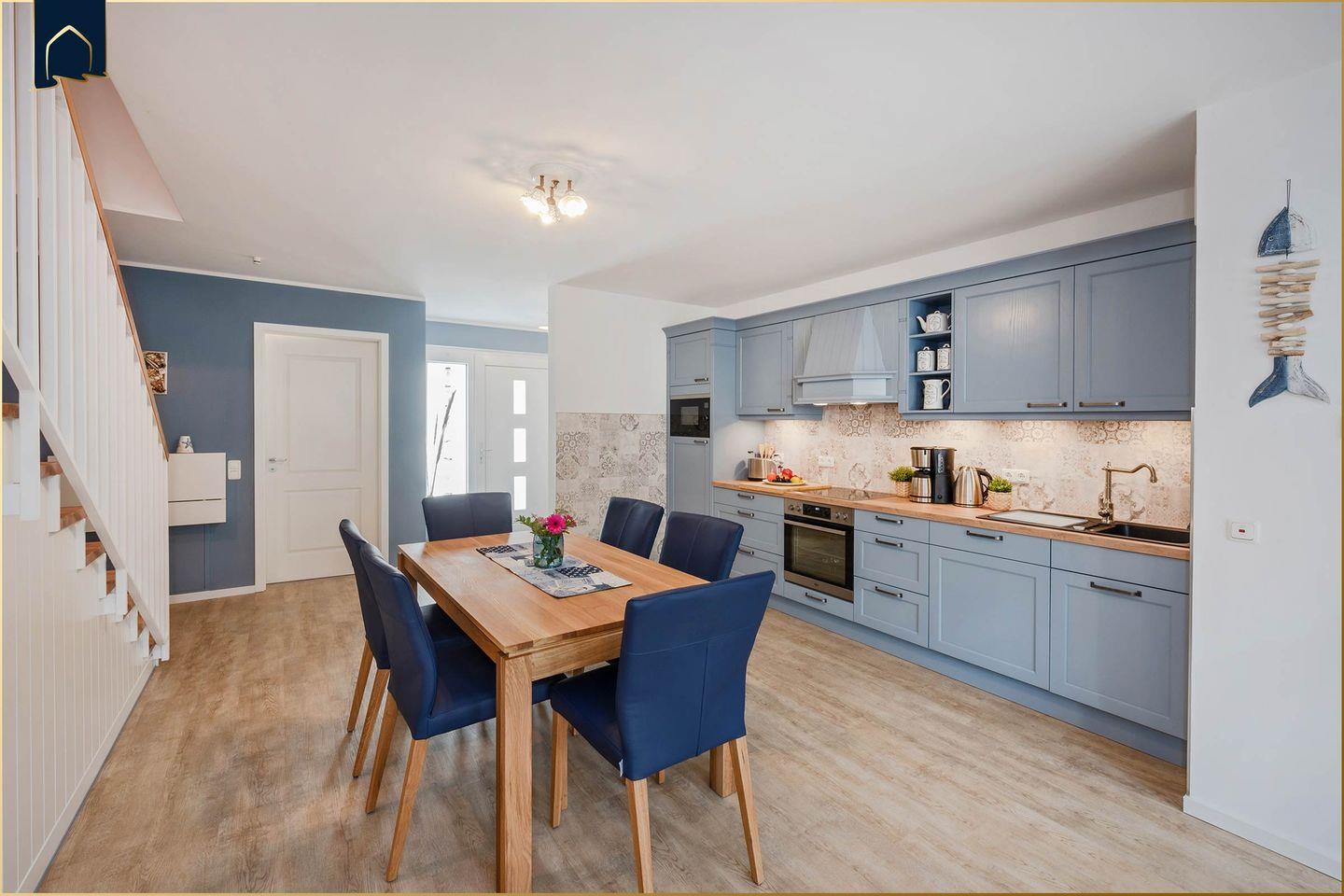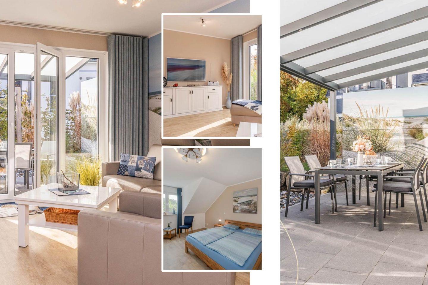 Dieses moderne Ferienhaus auf Usedom bietet mit 94?m² Wohnfläche, zwei Schlafzimmern und zwei Badezimmern die perfekte Unterkunft für bis zu fünf Personen. Es liegt nur etwa 700?Meter vom feinen Ostseestrand entfernt und ist auf zwei Etagen großzügig und stilvoll eingerichtet. Das lichtdurchflutete Wohnzimmer mit Sofaecke, TV und Zugang zur überdachten Terrasse lädt zum Entspannen ein. Die offene Küche mit Backofen, Herd, Kühlschrank, Spülmaschine, Kaffeemaschine und vielen weiteren Annehmlichkeiten macht die Selbstverpflegung ganz einfach. Für den Essbereich steht ein großer Esstisch bereit – ideal für gemeinsame Mahlzeiten mit Familie oder Freunden.