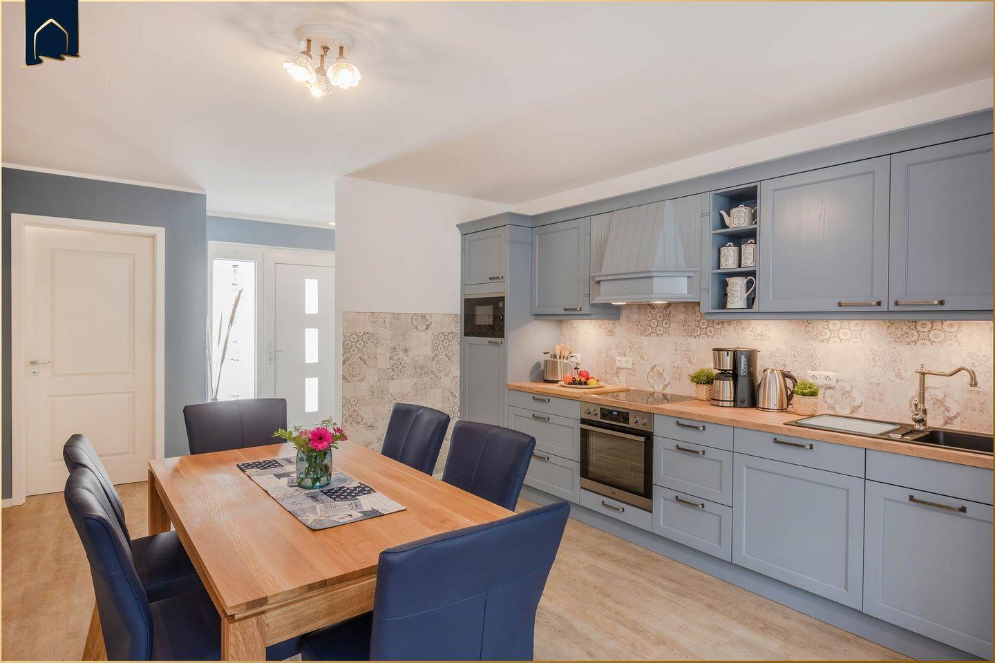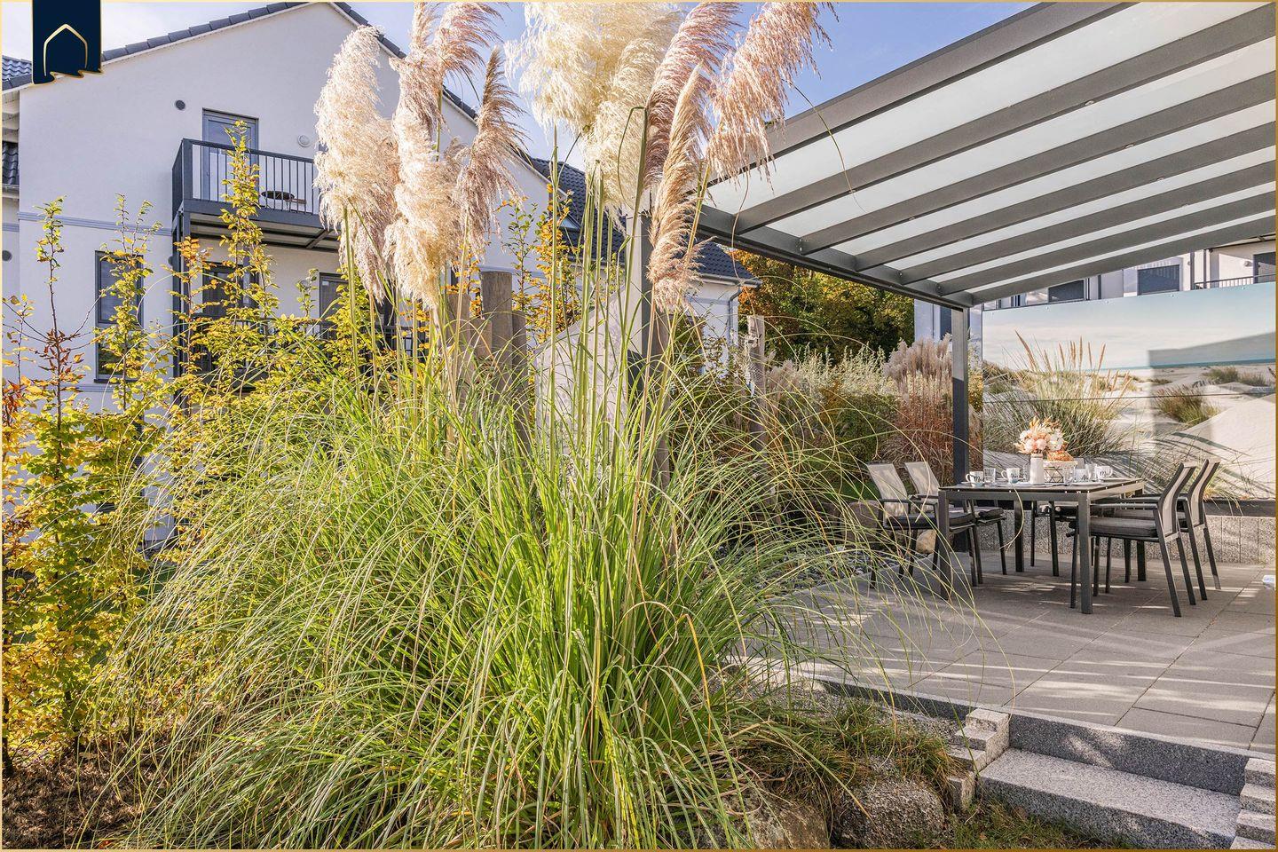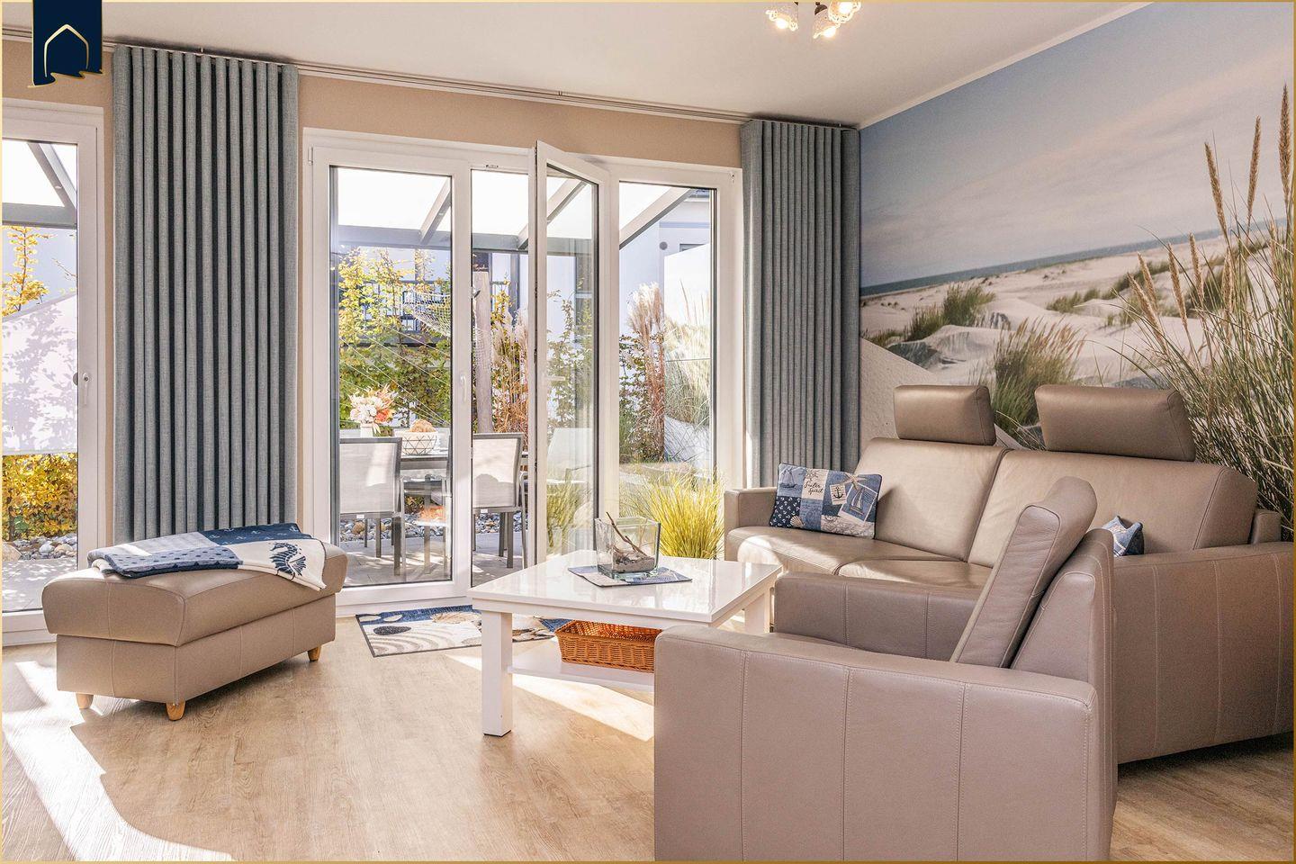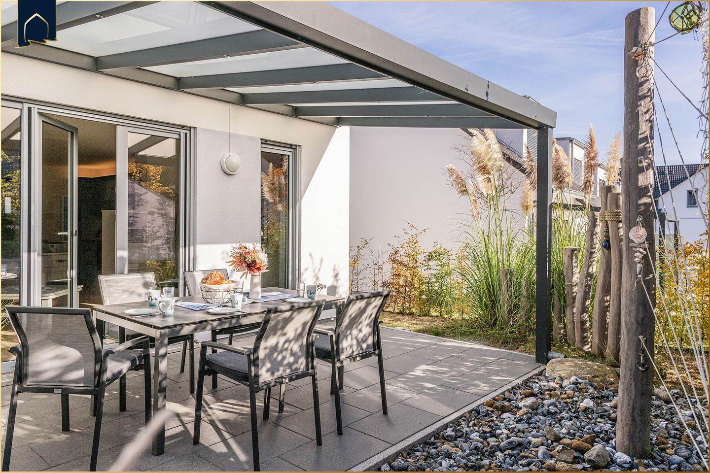 Dieses moderne Ferienhaus auf Usedom bietet mit 94?m² Wohnfläche, zwei Schlafzimmern und zwei Badezimmern die perfekte Unterkunft für bis zu fünf Personen. Es liegt nur etwa 700?Meter vom feinen Ostseestrand entfernt und ist auf zwei Etagen großzügig und stilvoll eingerichtet. Das lichtdurchflutete Wohnzimmer mit Sofaecke, TV und Zugang zur überdachten Terrasse lädt zum Entspannen ein. Die offene Küche mit Backofen, Herd, Kühlschrank, Spülmaschine, Kaffeemaschine und vielen weiteren Annehmlichkeiten macht die Selbstverpflegung ganz einfach. Für den Essbereich steht ein großer Esstisch bereit – ideal für gemeinsame Mahlzeiten mit Familie oder Freunden.