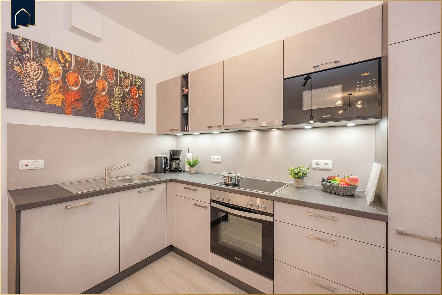 Die voll ausgestattete Küche verfügt über alles, was man zum Kochen und Genießen braucht – inklusive Backofen, Herd, Kühlschrank mit Gefrierfach, Spülmaschine, Mikrowelle, Wasserkocher, Toaster, Kaffeemaschine und sogar einem Eierkocher. Dank WLAN, TV und Fußbodenheizung wird es auch an kühleren Tagen besonders gemütlich. Ein praktischer Abstellraum, Waschmaschine sowie Staubsauger, Wäscheständer und ausreichend Stauraum in Garderobe und Kommoden runden das Gesamtpaket ab.