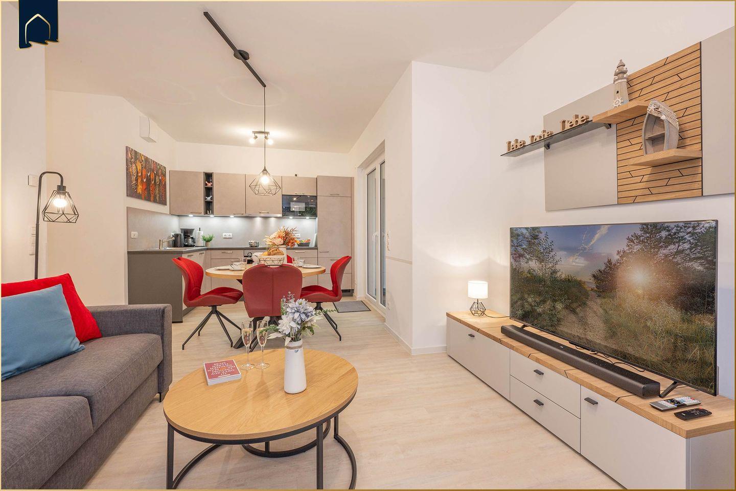 Diese stilvolle Ferienwohnung auf 75?m² bietet alles, was das Urlaubsherz begehrt. Ideal geeignet für Familien oder kleine Reisegruppen finden hier bis zu vier Personen bequem Platz. Zwei separate Schlafzimmer und zwei moderne Badezimmer sorgen für maximalen Komfort – vor allem, wenn man mit Kindern oder Freunden reist. Der lichtdurchflutete Wohnbereich mit gemütlicher Sofaecke, großem Esstisch und offener Küche lädt zum Entspannen ein. Besonderes Highlight: die moderne Heimkinoanlage sowie ein überdachter Balkon, der zu jeder Jahreszeit genutzt werden kann.