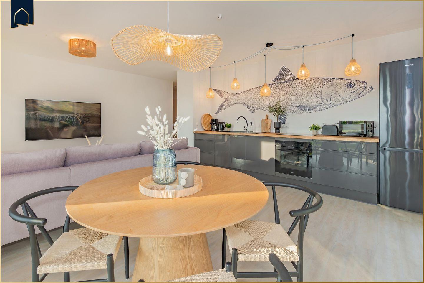 In der voll ausgestatteten Küche bleiben keine Wünsche offen: Induktionsherd, Mikrowelle, Backofen, Spülmaschine, Kaffeemaschine, Espressomaschine, Toaster, Mixer, Kühlschrank mit Gefrierfach … alles da! Dank durchdachtem Design ohne Hängeschränke ist alles leicht zugänglich – perfekt für kleine oder große Helfer am Tisch.