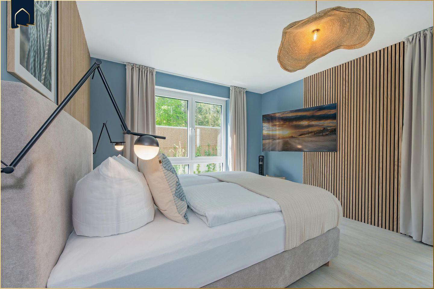 Im Schlafzimmer erwartet dich ein hochwertiges Boxspringbett mit komfortabler Einstiegshöhe – für einen besonders erholsamen Schlaf. Auch hier sorgt ein großer Fernseher für entspannte Abende. Und das Schönste: Vom Bett aus geht’s direkt auf die überdachte Terrasse!