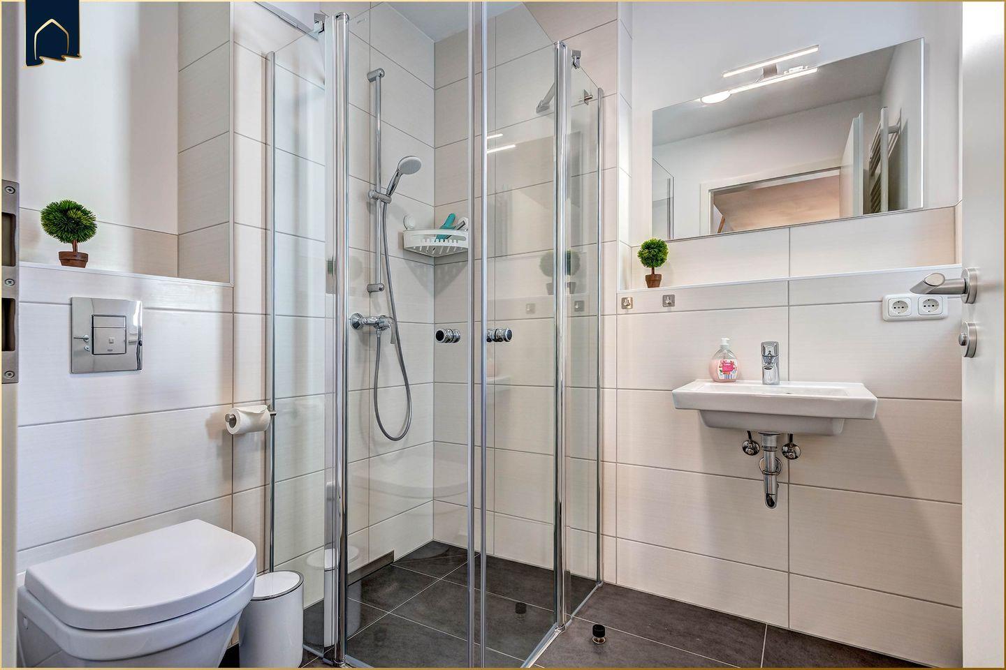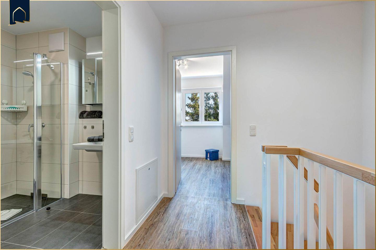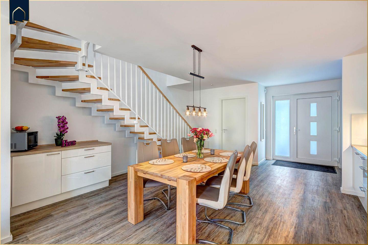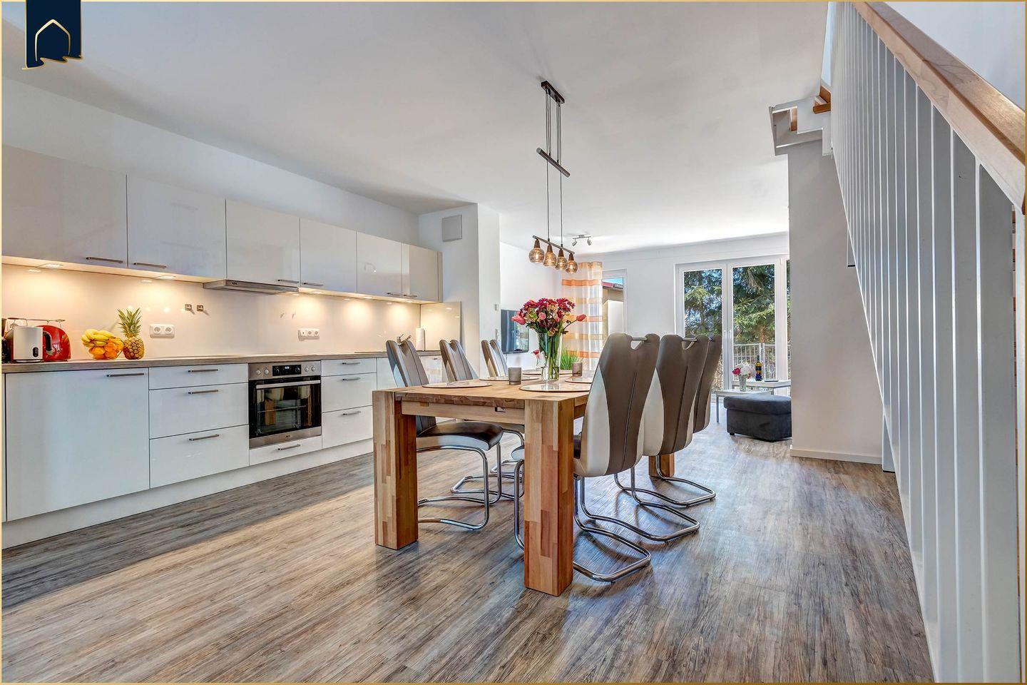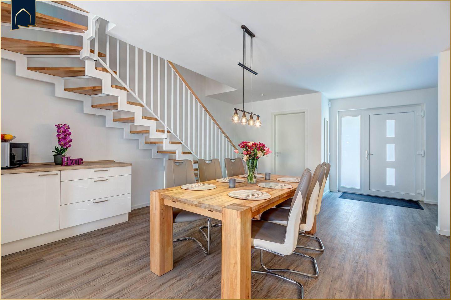 Die offene Wohnküche mit Ceranherd, Spülmaschine, Kaffeemaschine und vielem mehr lässt keine Wünsche offen und ist bestens ausgestattet, um gemeinsam zu kochen und zu genießen. Der große Esstisch lädt zu ausgedehnten Mahlzeiten mit der Familie ein. Im Erdgeschoss befindet sich zudem eines der beiden modernen Bäder mit bodengleicher Dusche. Eine Waschmaschine ist vorhanden.