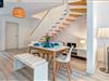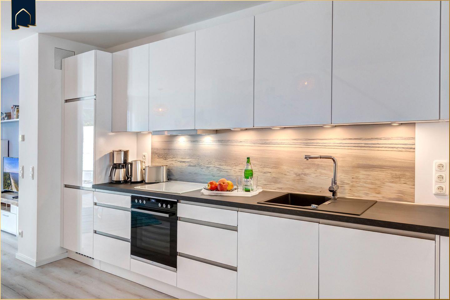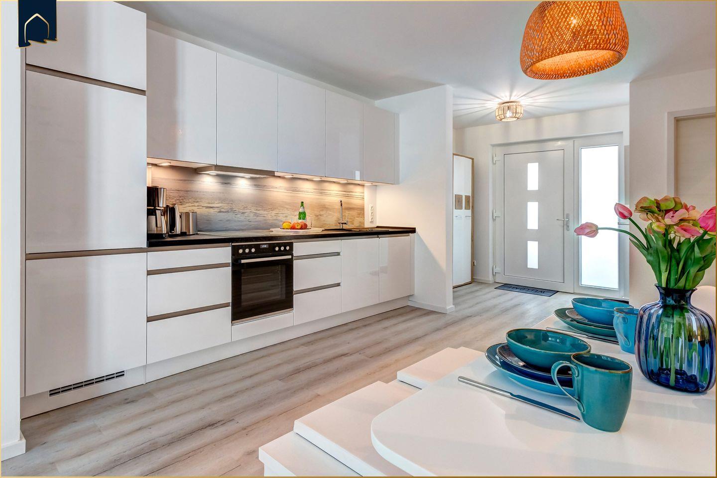 Die offene Küche ist modern ausgestattet und verfügt über Cerankochfeld, Backofen, Mikrowelle, Geschirrspüler, Kühlschrank, Kaffeemaschine, Espressomaschine, Toaster, Wasserkocher sowie umfangreiche Küchenutensilien. Damit eignet sich das Haus ideal für die Selbstversorgung während des Urlaubs.