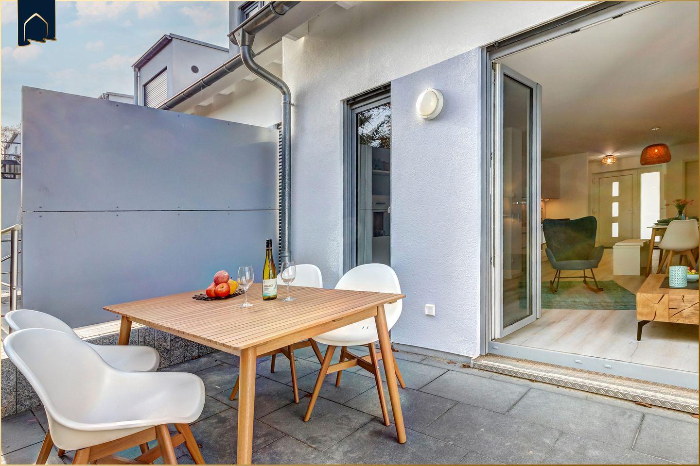 Der private Terrassenbereich lädt zu entspannten Stunden im Freien ein – ob zum Frühstück, Lesen oder Ausklang des Tages. Ein kostenfreier Privatparkplatz gehört zur Unterkunft. Das Reihenhaus ist ein Nichtraucherobjekt. Die Mitnahme von Haustieren ist nicht erlaubt.