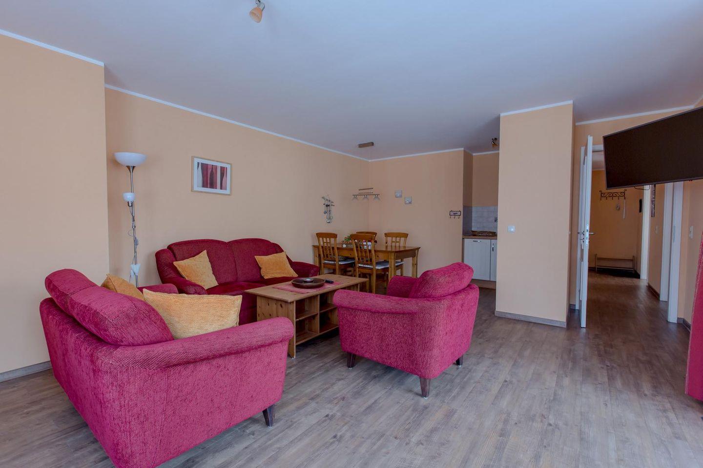 Unsere größte Ferienwohnung: Diese ca. 85 qm große, geräumige 3-Zimmer-Wohnung befindet sich in der 1. Etage der Villa Senta.