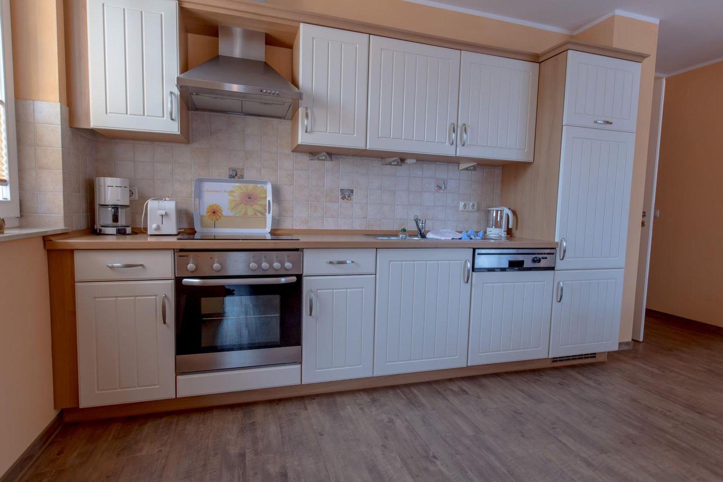 Offene Küchenzeile im Wohnraum mit Ceranfeld, Backofen, Geschirrspüler, Kühlschrank mit Gefrierfach