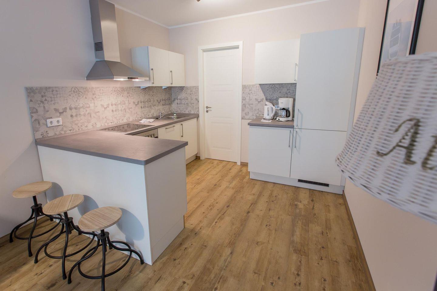 Küchenzeile im Wohnraum mit Ceranfeld, Backofen, Geschirrspüler, Kühlschrank mit Gefrierfach