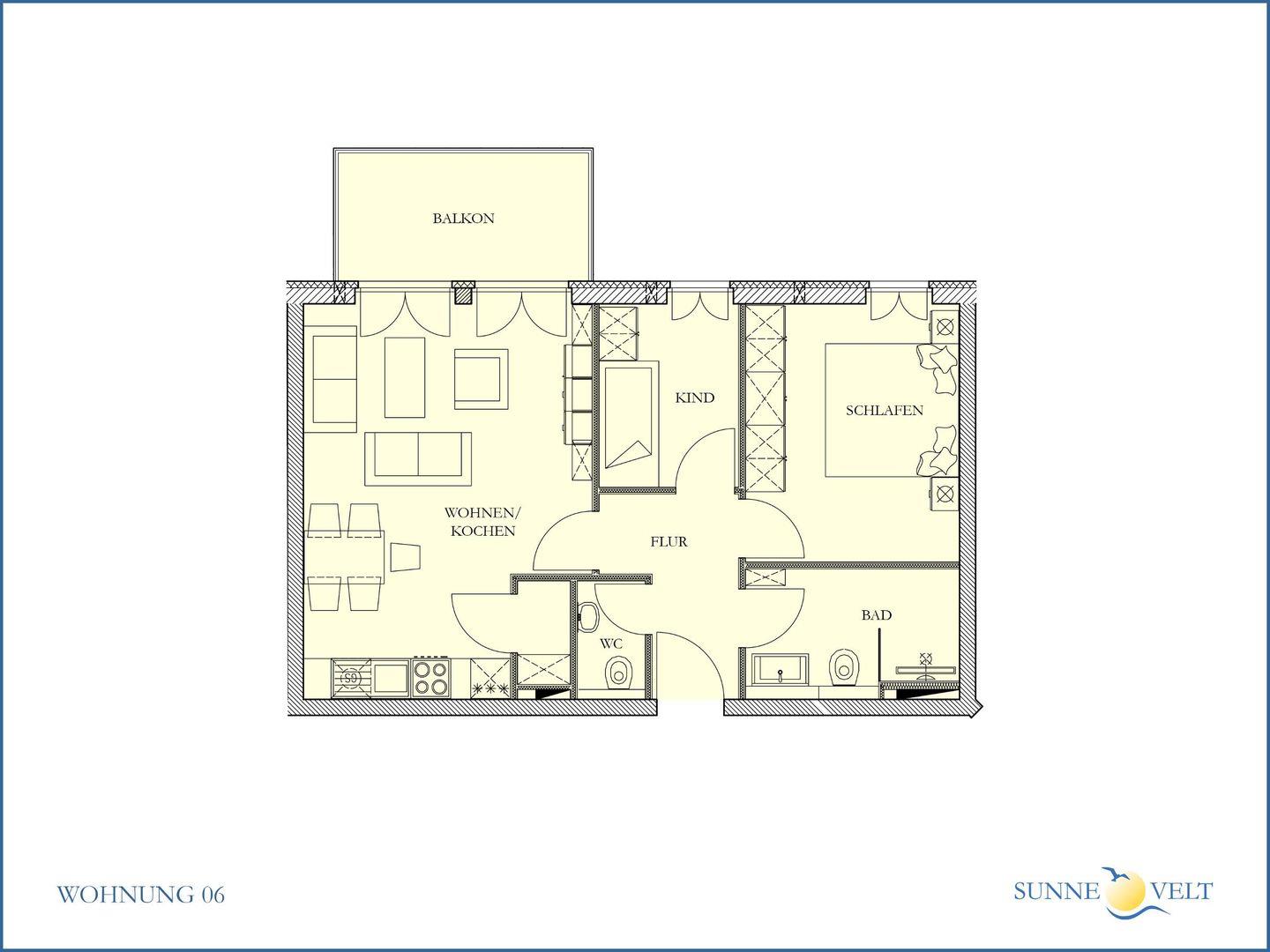 Die ca. 65 qm große 2-Zimmer-Wohnung. mit Balkon (Ausrichtung: Westen), befindet sich im Obergeschoss.
