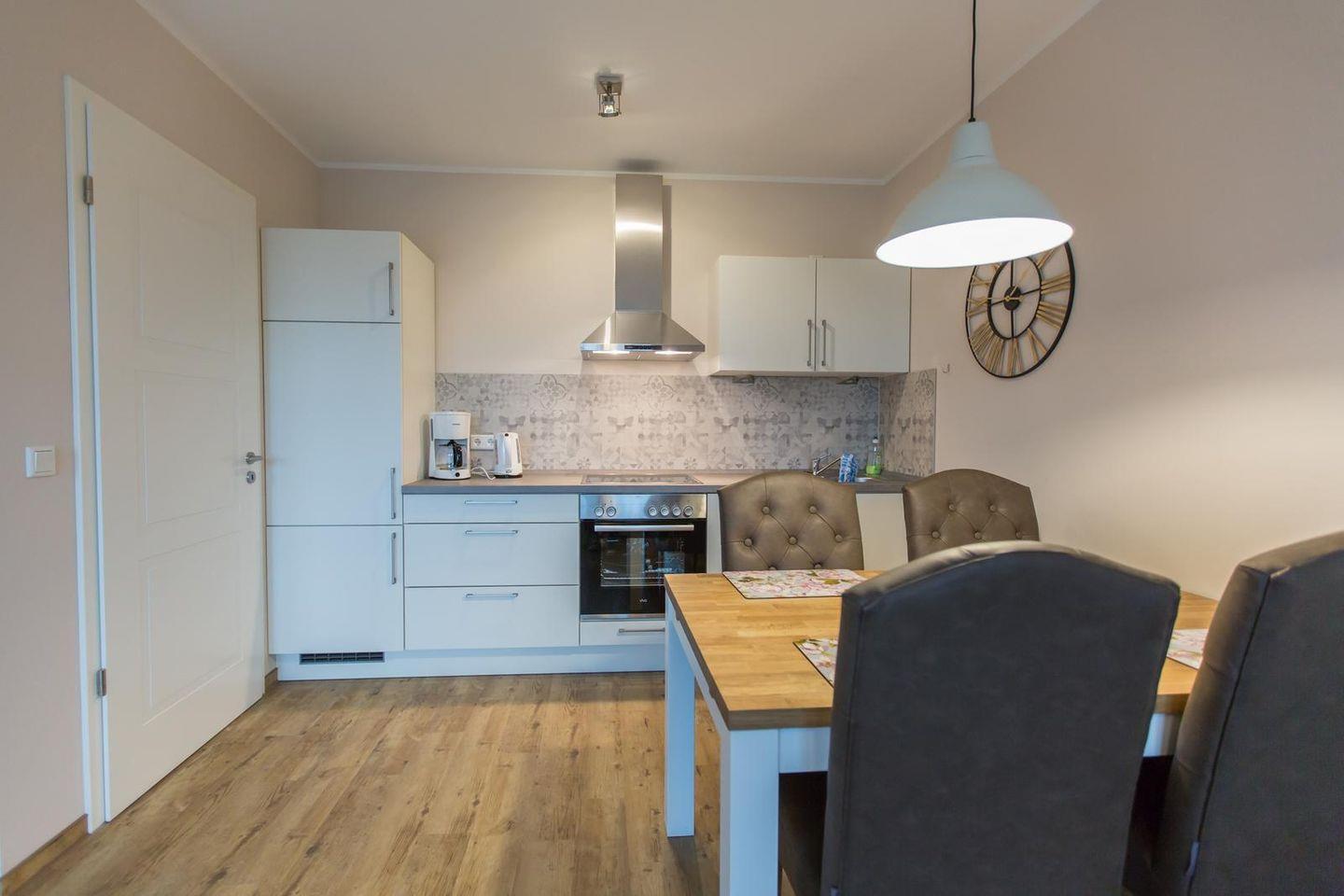 Küchenzeile im Wohnraum mit Ceranfeld, Backofen, Geschirrspüler, Kühlschrank mit Gefrierfach