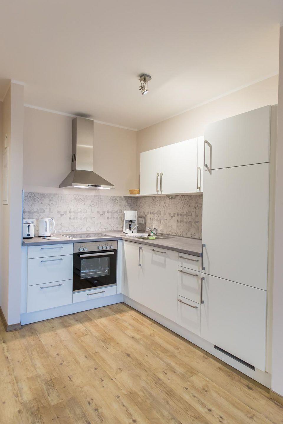 Küchenzeile im Wohnraum mit Ceranfeld, Backofen, Geschirrspüler, Kühlschrank mit Gefrierfach