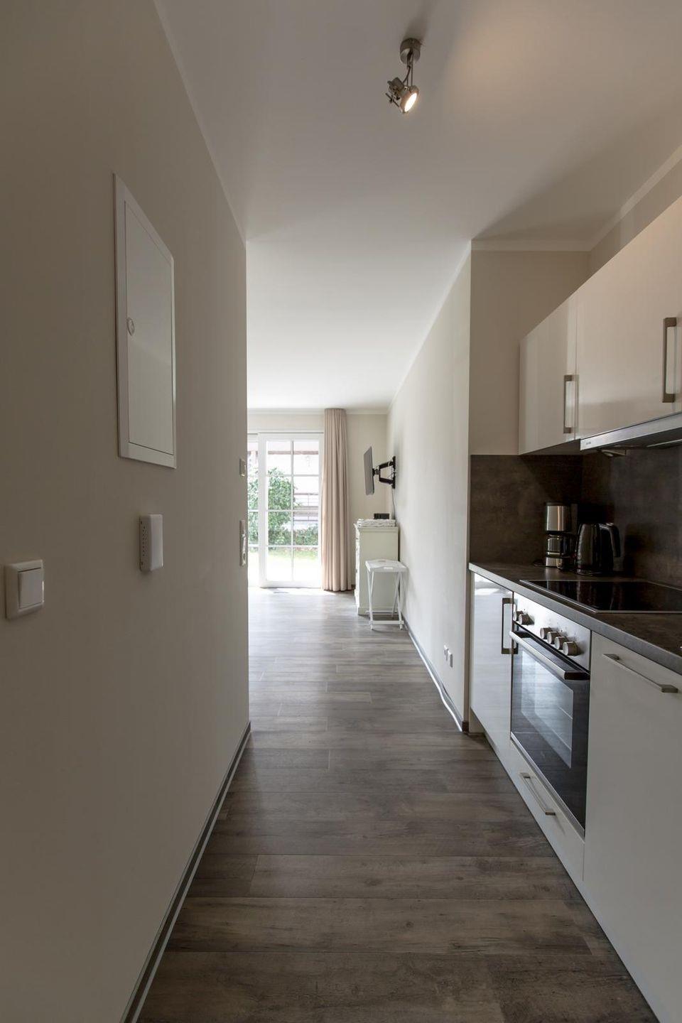 Offene Küchenzeile im Wohnraum mit Ceranfeld, Backofen, Geschirrspüler, Kühlschrank mit Gefrierfach