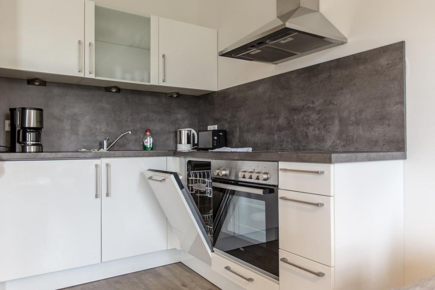 Offene Küchenzeile im Wohnraum mit Ceranfeld, Backofen, Geschirrspüler, Kühlschrank mit Gefrierfach