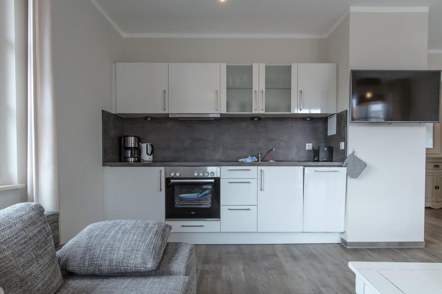Offene Küchenzeile im Wohnraum mit Ceranfeld, Backofen, Geschirrspüler, Kühlschrank mit Gefrierfach