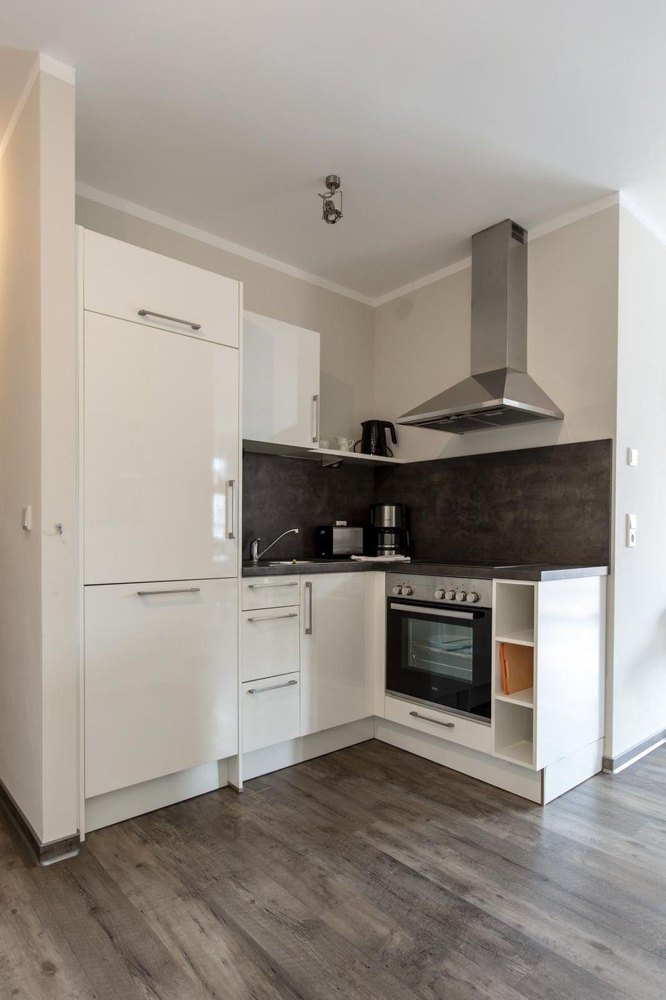 Offene Küchenzeile im Wohnraum mit Ceranfeld, Backofen, Geschirrspüler, Kühlschrank mit Gefrierfach